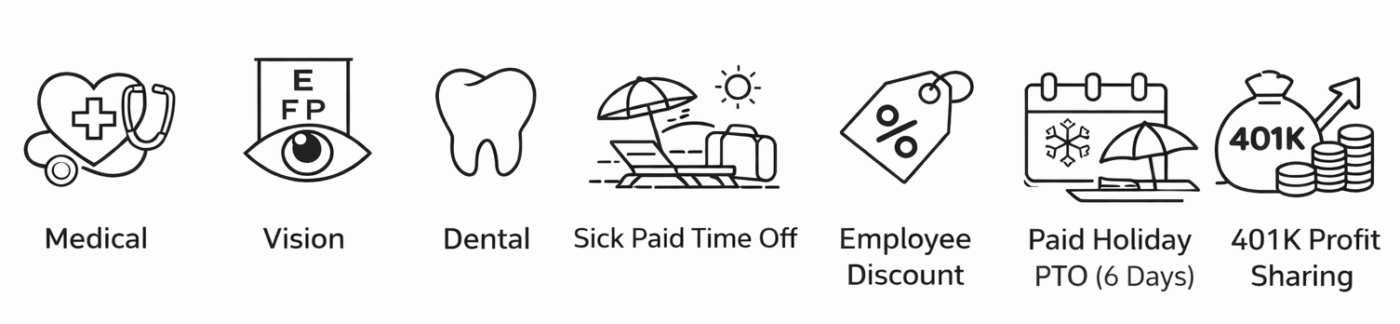 Dirty Bird Industries offers a robust benefits package that supports health, work-life balance, and long-term financial security. Team members receive medical, dental, and vision insurance, along with sick and personal paid time off and six paid holidays each year. A generous employee discount applies across the full product lineup. The company also provides a 401(k) plan with profit sharing and annual bonus opportunities, helping employees build a strong future while enjoying the rewards of their work.