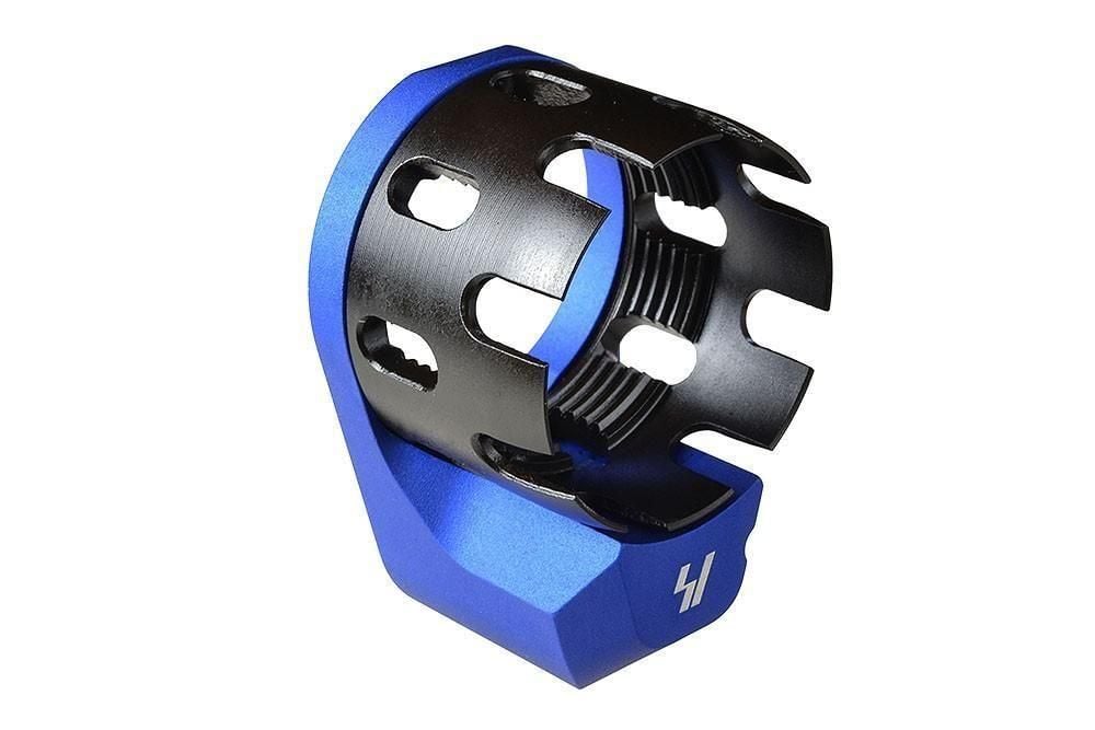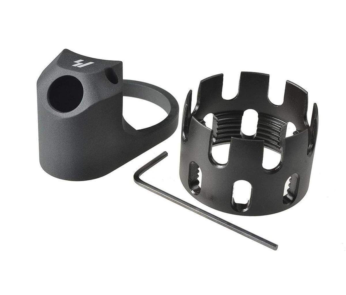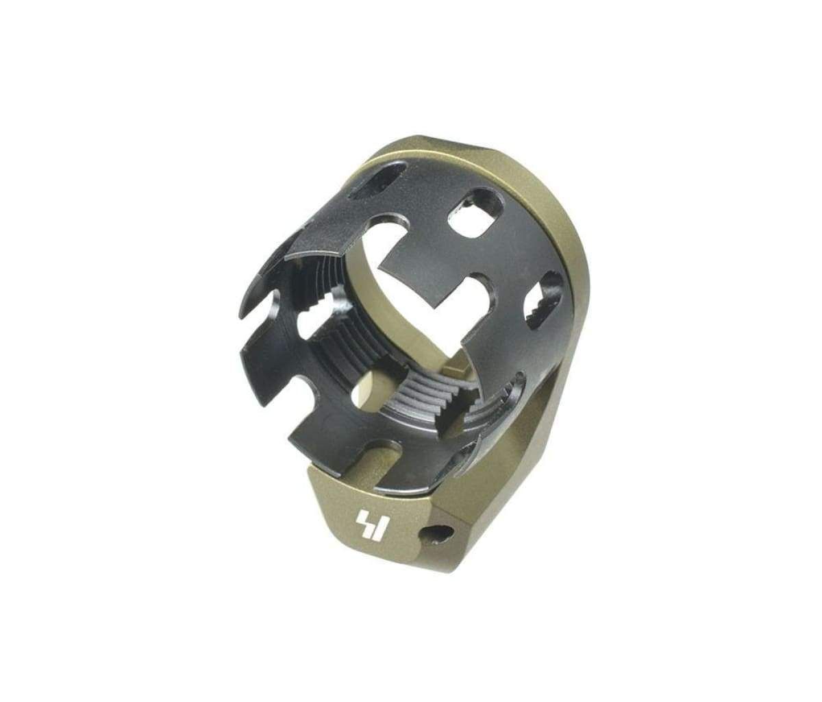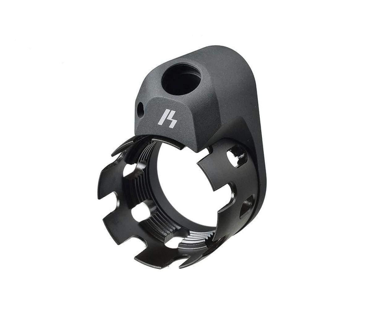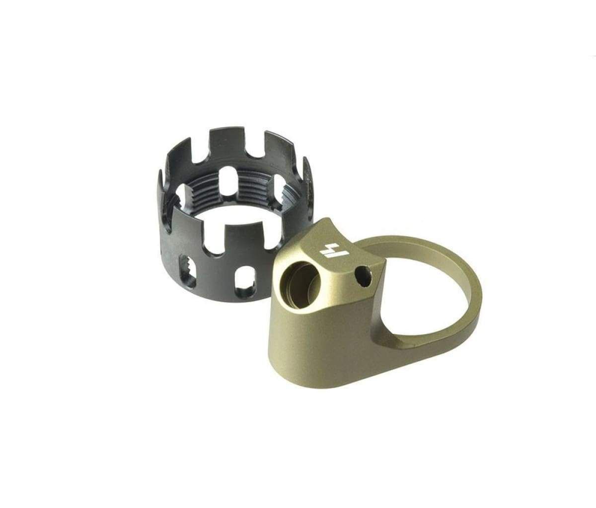 Yet another first, the Enhanced Castle Nut and Extended End plate combo represent Strike Industries dedication to thinking outside the box. The SI Enhanced ECN and EEP stand out from the generic parts kit units in both aesthetics and function. The steel castle nut has been lengthened to match the extended end plate, supporting more of the receiver extension s threaded area, and improving aesthetics. The extended end plate features a Quick Detach sling swivel mount, pushed back away from the webbing of the primary hand. This allows weapons manipulations in tight spaces and under stress, without the startling pain that can result from a pinched hand when using a sling attached to a standard, flat QD end plate.