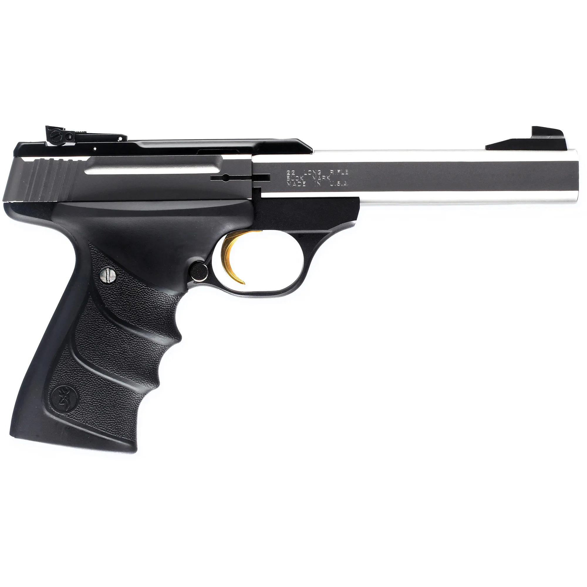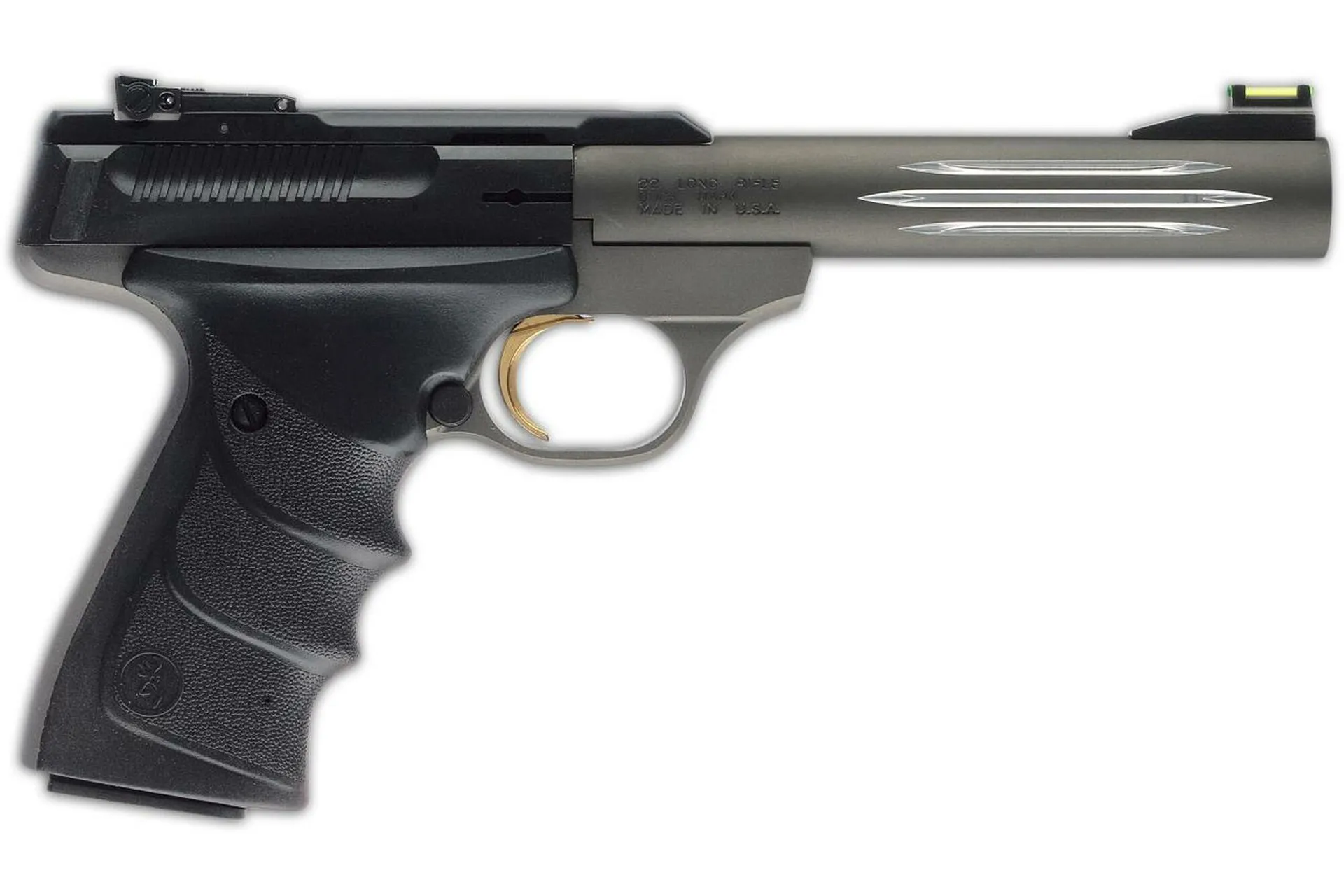 Browning’s Buck Mark rimfire pistol leads the industry in quality reliability accuracy and variety. It is constructed of a solid piece of aircraft-grade 7075 aluminum alloy and then CNC machined to exacting tolerances. The crisp single-action trigger hand reamed chamber target crowned barrel and finely adjustable target sights mean the Buck Mark comes ready for fun straight from the box. Its slide features built-in recess and raised side panels for better grip along with a manual slide release. The Buck Mark utilizes a Pro-Target rear sight and a manual thumb safety.The Lite model is all the accuracy enhancing features you expect from a Buck Mark pistol in a lightweight package. The alloy barrel sleeve quickly dissipates barrel heat and gives a consistent barrel profile without the weight of a solid steel barrel.This CA model has a matte gray steel alloy barrel fiber-optic front sight and Ultragrip RX ambidextrous grips with finger grooves.