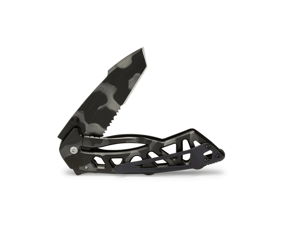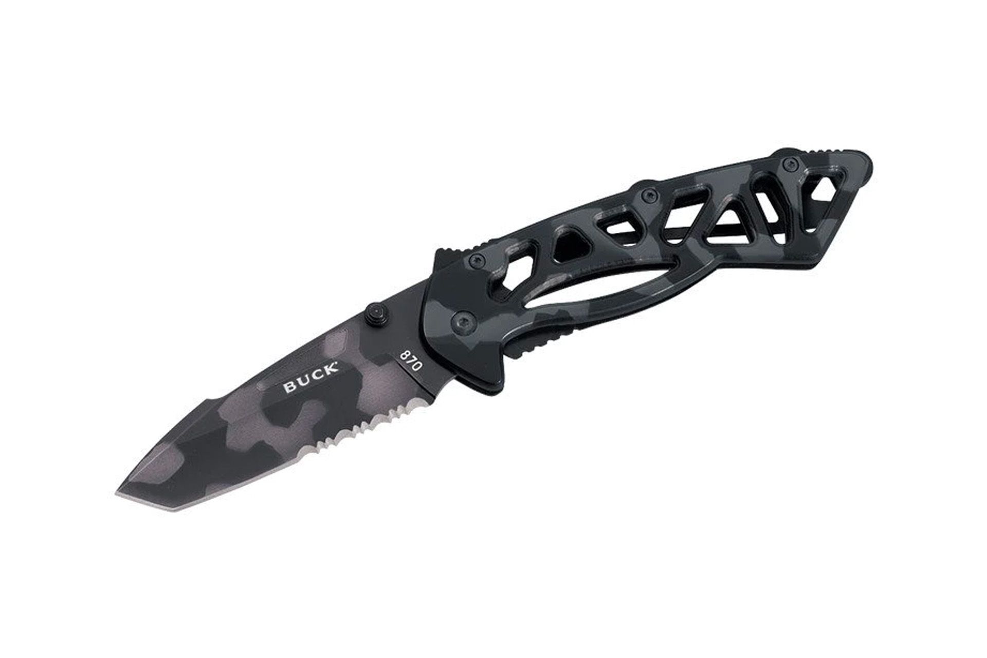 This is a frame-lock knife with quick and reliable one-hand deployment, innovative tactical coatings, and the quality of a Buck knife for an affordable price. Designed with special attention to ergonomics, including a curved handle with grip points, it ensures a secure grasp. To keep this knife at its lightest, the skeletal framework minimizes material weight, while maintaining strength.