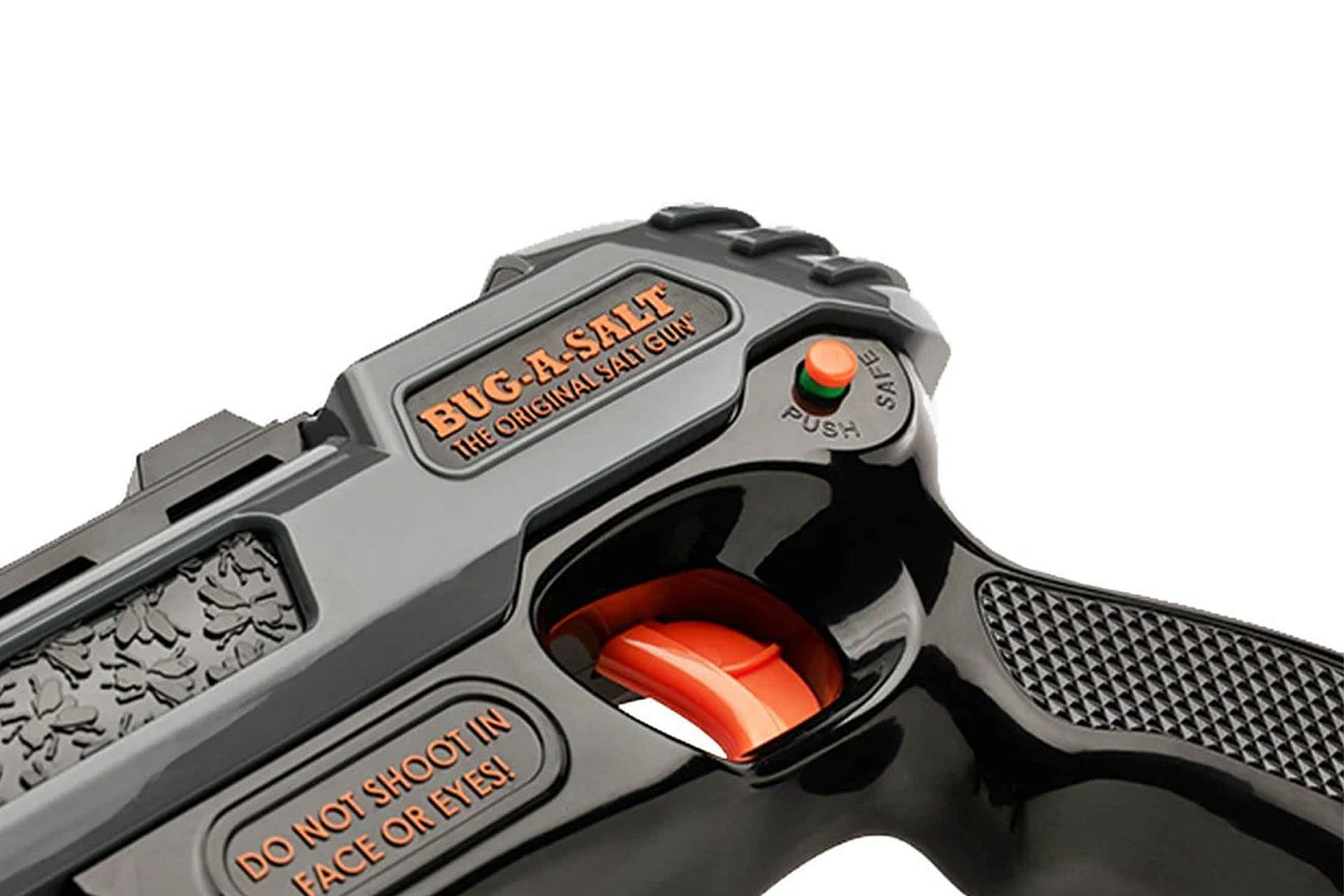 The BUG-A-SALT 3.0 is specifically tailored to the needs of the more serious fly hunter. Custom improvements such as Cross-Bolt Safety, trigger redesign, and Patridge Sight (not to be confused with the bird; the sight is named after the famous rifleman Patridge) are guaranteed to turn grown men into little kids again. Join over 6 million humans on planet Earth and turn annoyance into fun! Non-toxic and no batteries required.