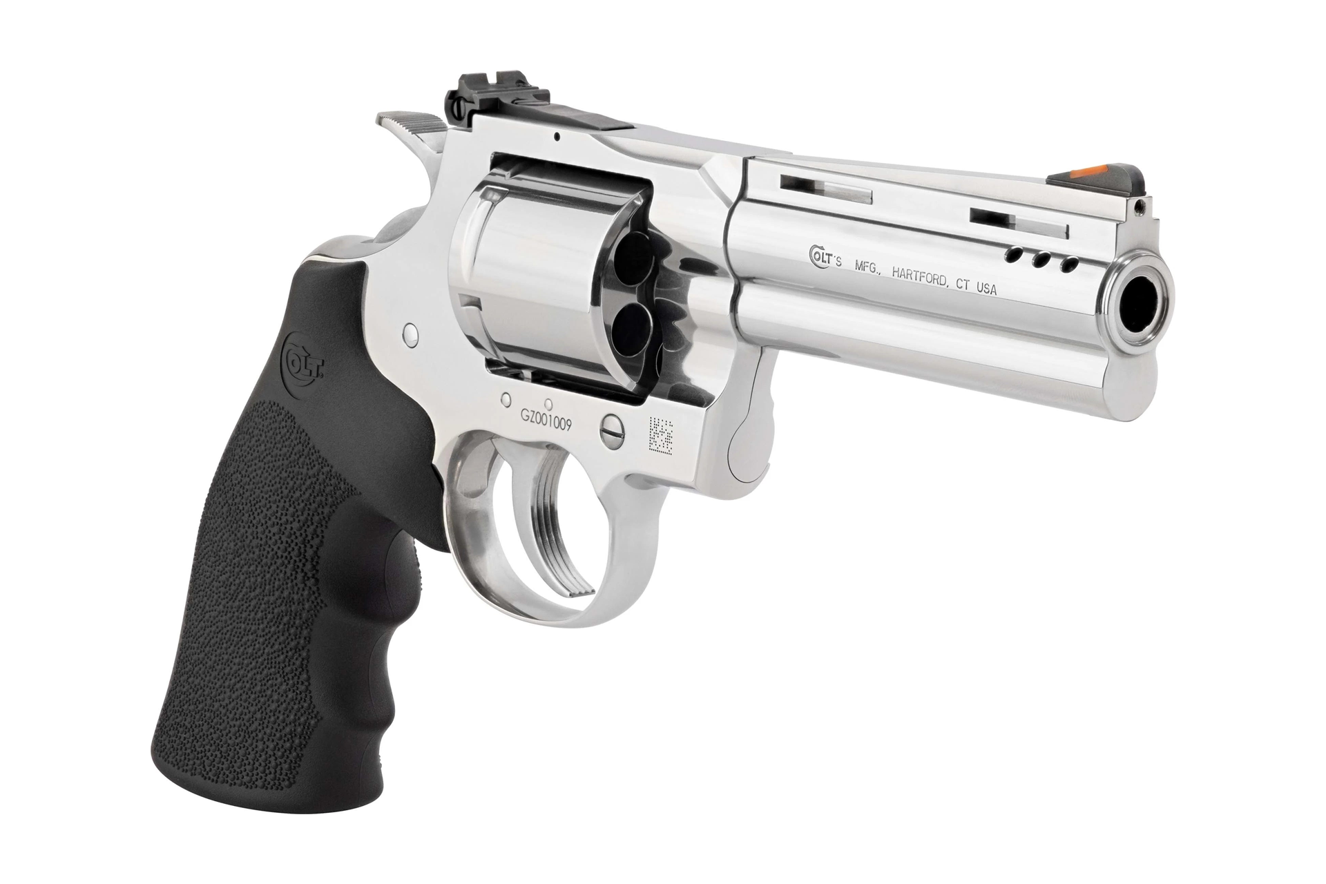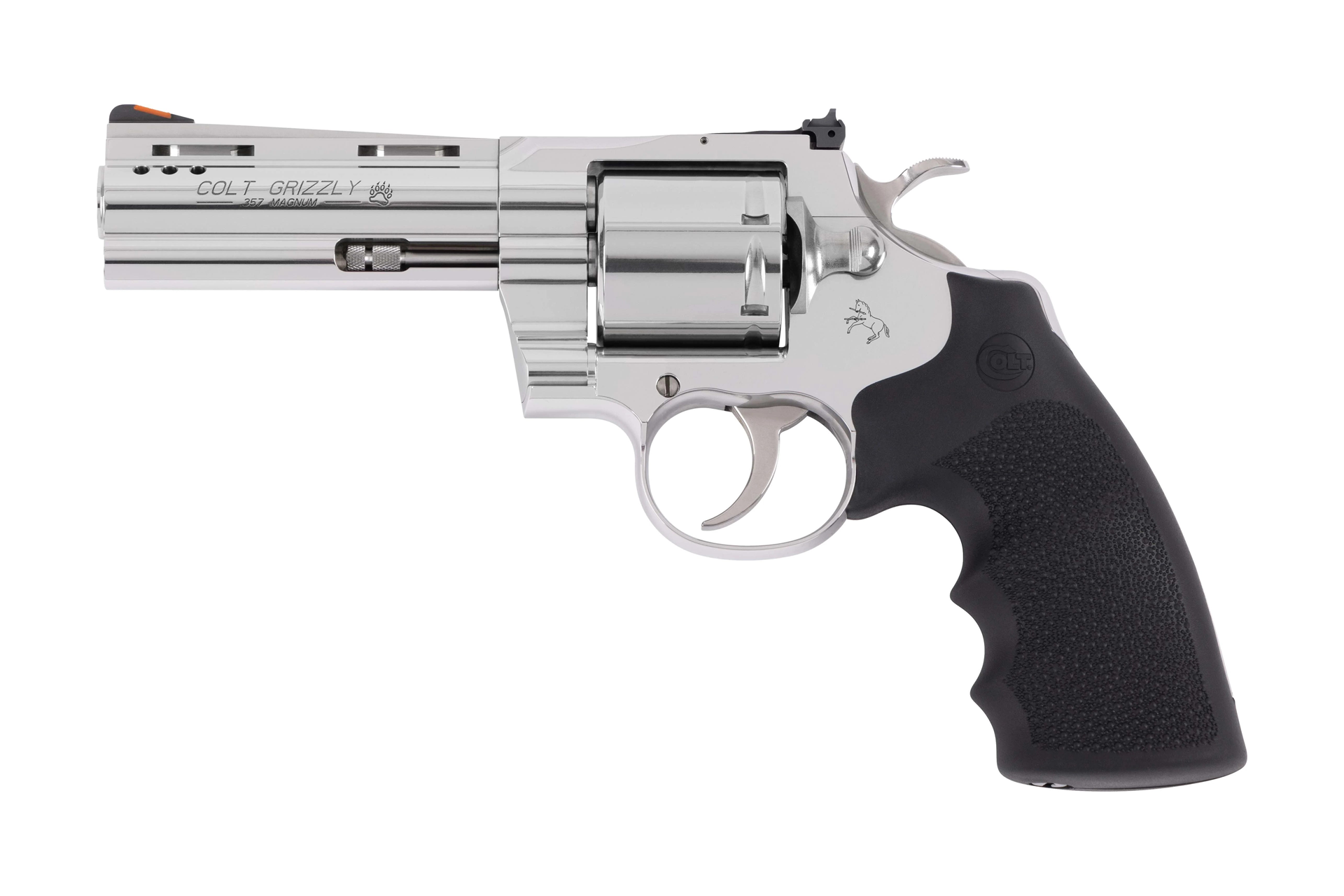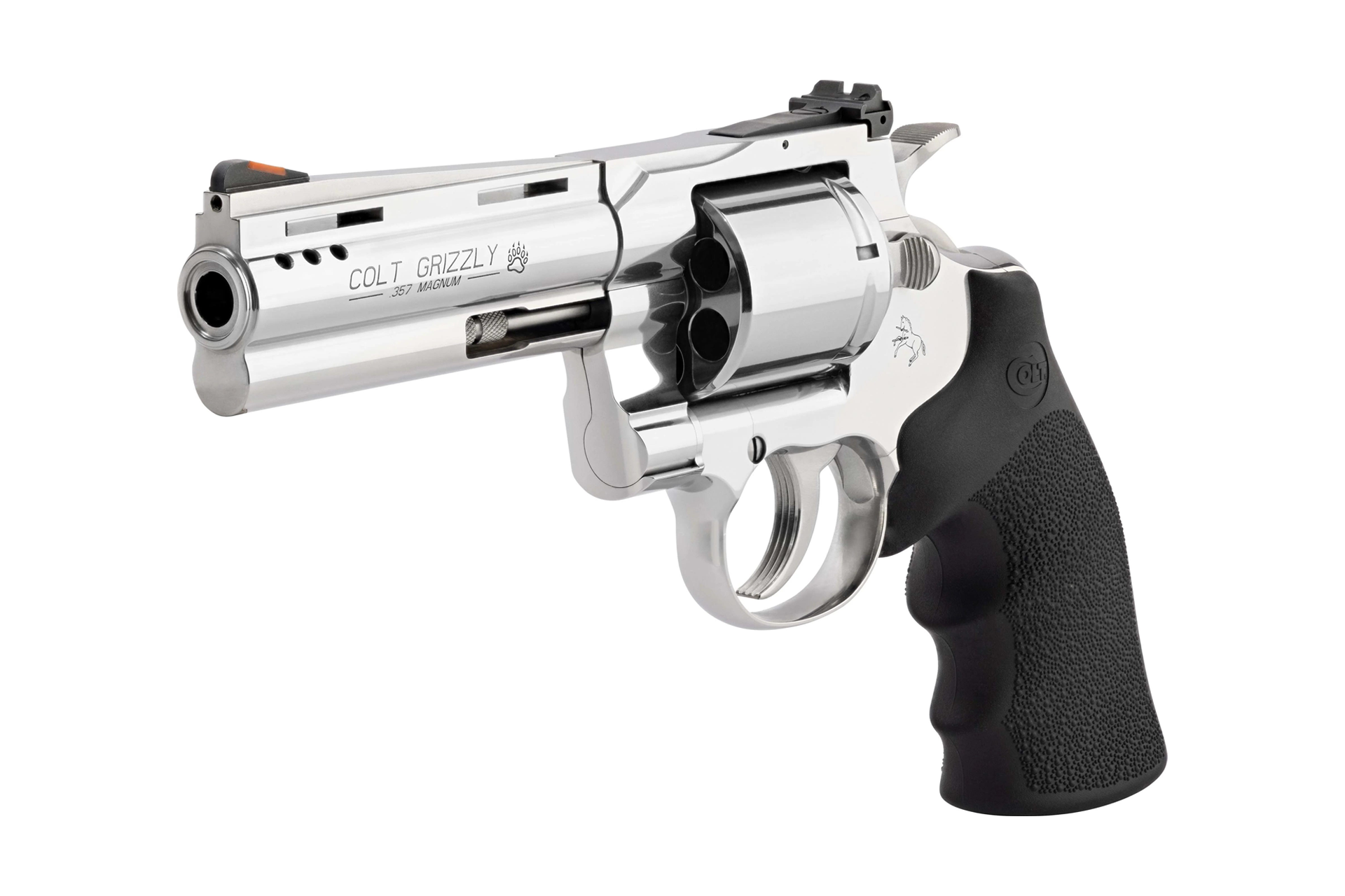 The Colt Grizzly features a polished stainless steel finish, providing a sleek and durable exterior. Its steel frame ensures robustness and longevity, making it a reliable choice for various shooting applications. The black Hogue grips offer a comfortable and secure hold, enhancing control and accuracy.