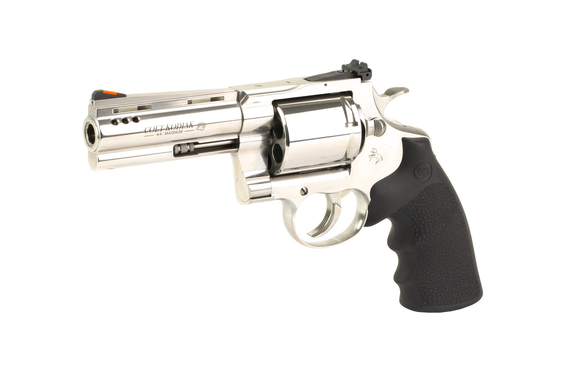 The Colt Kodiak is built on a solid steel frame, providing the strength needed to handle the potent .44 Magnum cartridge. The 4.25″ barrel, paired with a 1-in-20″ rate of twist, ensures excellent accuracy and ballistic performance. The revolver’s unfluted cylinder adds to its unique aesthetic while maintaining the traditional look and feel of a classic revolver. The polished stainless steel finish not only enhances its durability but also gives it a refined, professional appearance.