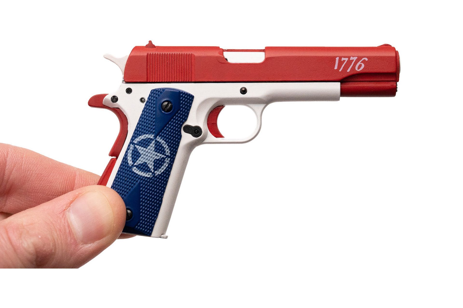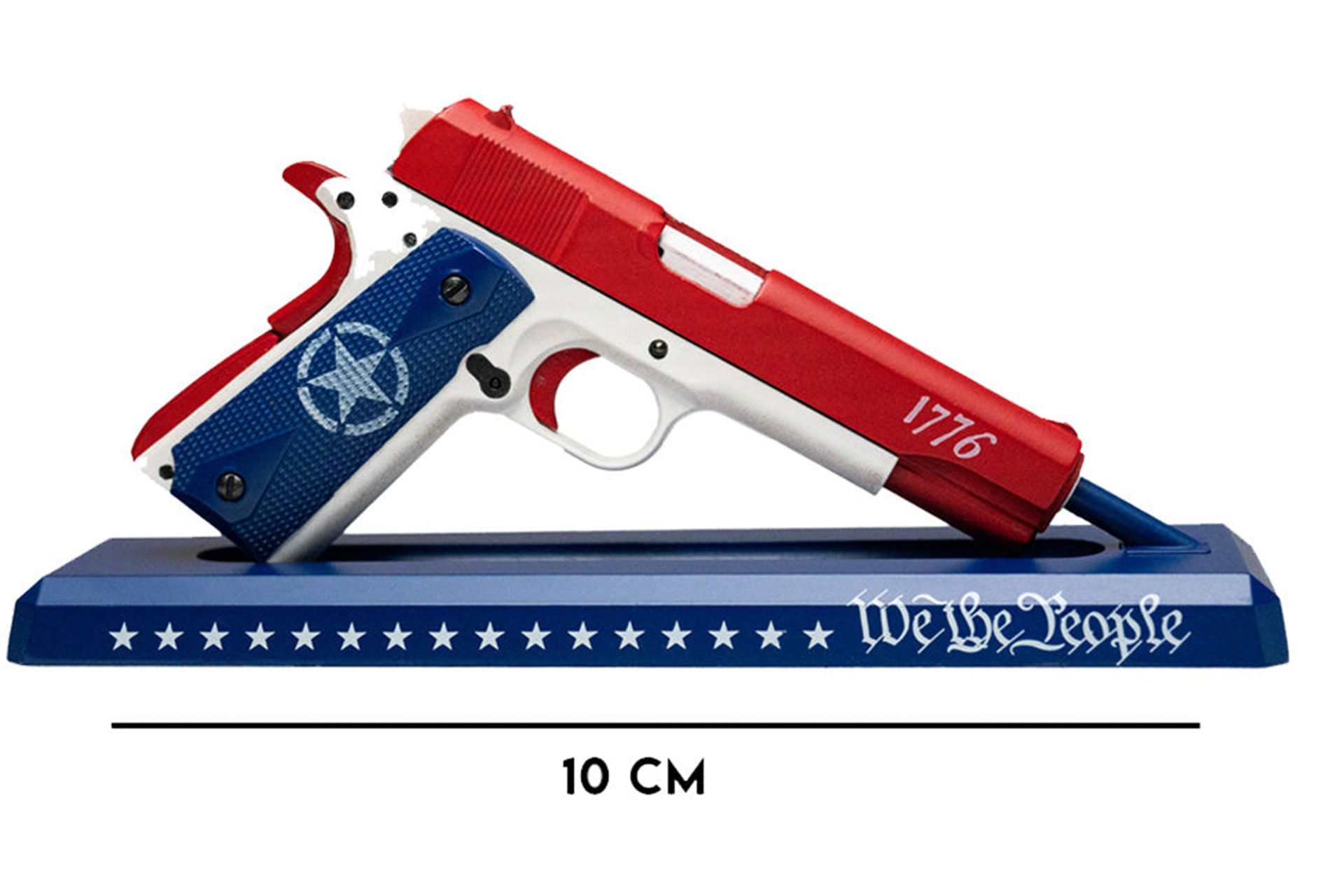 USA themed, one of a kind 1911 miniature model. A little bit about the history of the 1911… Designed by John Browning in the early 20th century. It’s chambered for the .45 ACP cartridge and has been in service since, well, 1911. This iconic pistol has a distinctive design with a single-stack magazine and a short-recoil system. It served as the standard-issue sidearm for the United States military for several decades. The 1911 is celebrated for its ergonomics, stopping power, and timeless design. Its legacy includes its widespread civilian use and enduring influence on pistol design and customization.