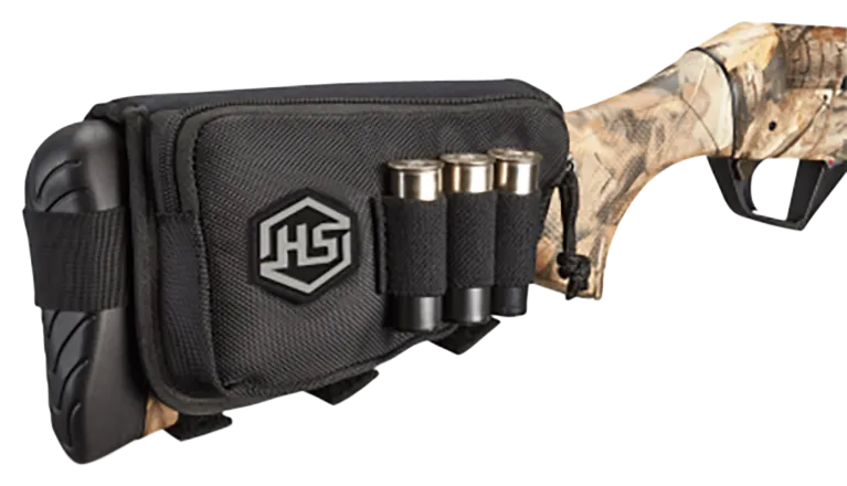 Made of heavy-duty polyester this convenient shotgun shell holder has adjustable Velcro� straps to secure it to the buttstock of your shotgun. Its suede cheek piece adds comfort and protects the stock of the gun. This hunting accessory provides easy access to 3 shotshells and includes a zippered pouch for additional ammo and other accessories.