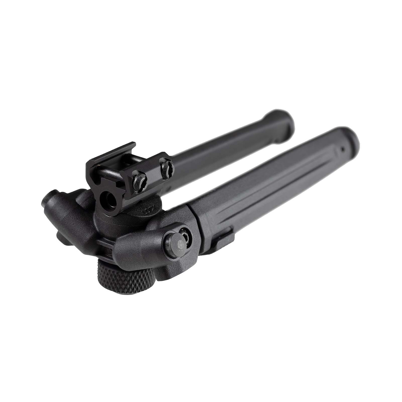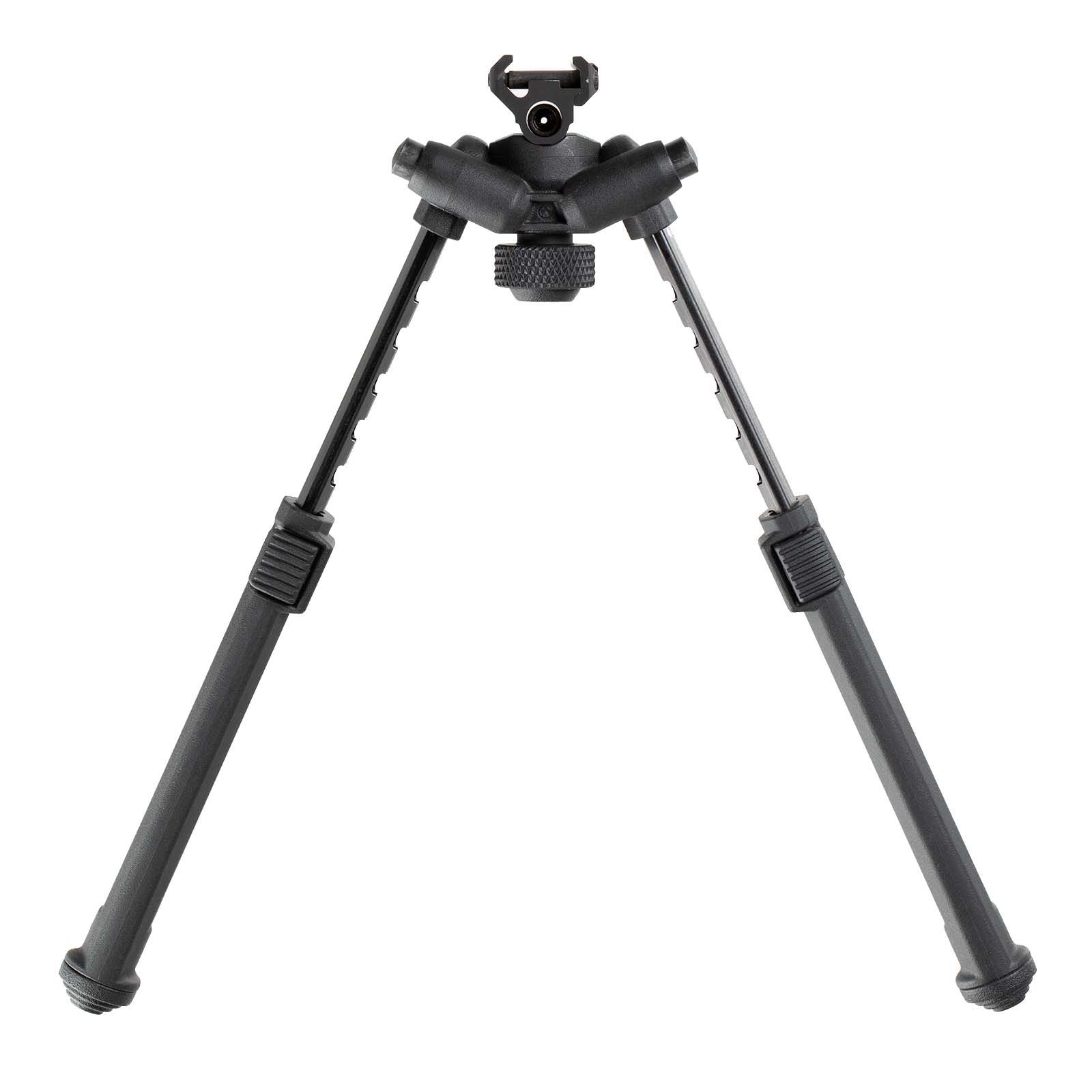 Deploying and adjusting the Magpul Bipod is quick and easy. Spring-tensioned legs stow neatly forward and snap down and lock into place with one hand. Leg extensions slide and lock securely with the push of a button on any of the seven half-inch spaced locking detents. The legs extend a full four inches, from 6.3” to 10.3”. An industry-exclusive 50° of total tilt and 40° of total pan are controlled by a glove-friendly knurled tool-less bipod locking knob located between the extended legs, allowing easy adjustment between shots. Additionally, the Magpul Bipod has the exclusive ability to lock pan at 0° while maintaining full tilt functionality.