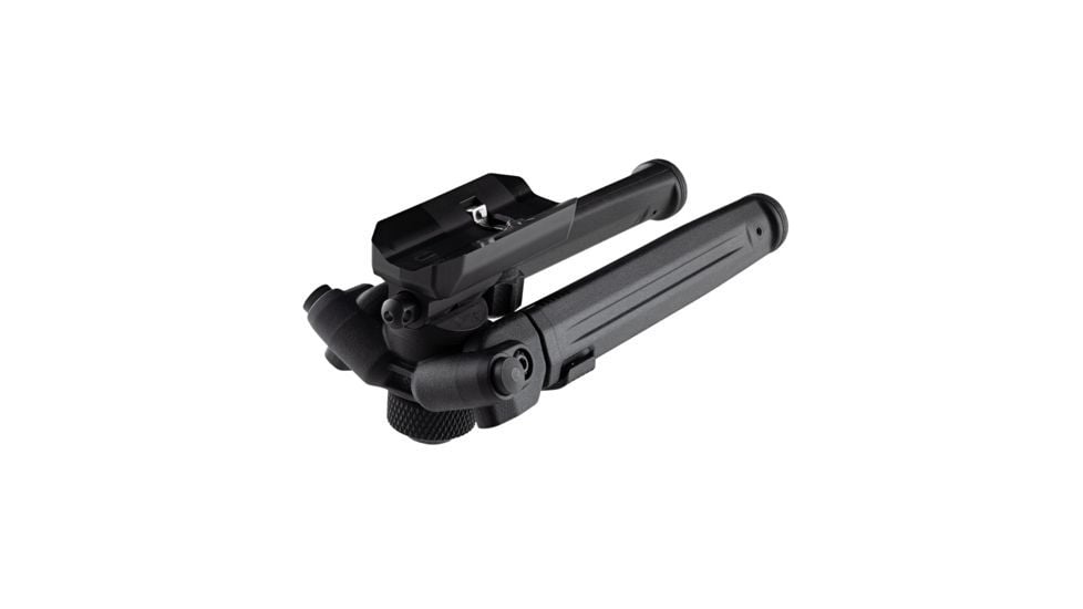 Deploying and adjusting the Magpul Bipod is quick and easy. Spring-tensioned legs stow neatly forward and snap down and lock into place with one hand. Leg extensions slide and lock securely with the push of a button on any of the seven half-inch spaced locking detents. The legs extend almost 3.5 inches, from 6.7 to 10.0″ in length. An industry-exclusive 50 of total tilt (+/- 25 degrees on either side) is controlled by a glove-friendly knurled tool-less bipod locking knob located between the extended legs, allowing easy adjustment between shots.