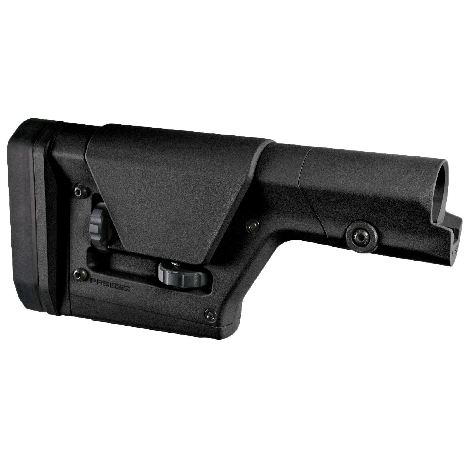 With solid adjustments for length of pull and cheek piece height via aluminum detent knobs, the PRS GEN3 (Precision Rifle/Sniper) stock provides a stable interface and is intended for semi-automatic sniper or varmint type rifles. Offering a nearly universal fit, it is optimized for rifle-length receiver extensions but will also mount to many mil-spec carbine and A5-length tubes. Includes a cant/height-adjustable rubber butt-pad and rotation-limiting QD sling swivel cups as well as M-LOK slots on the bottom for rear monopod mounting.