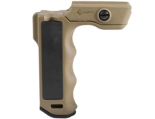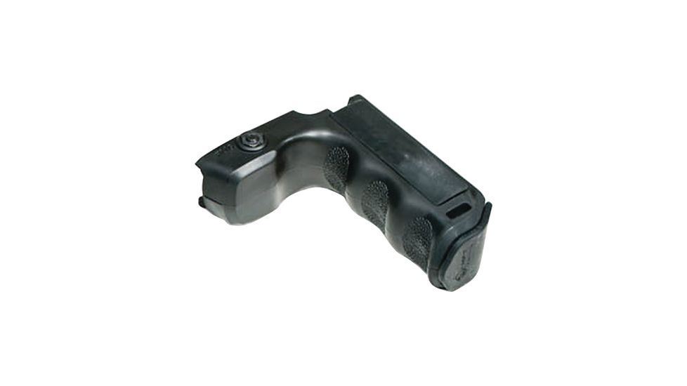 A compact textured vertical grip designed for close handhold application at the low ready or CQB situations. Locates support hand forward of the magazine well to prevent injury if an overcharged round causes the ejection of the magazine. Right and left handed pressure pad wells for wired switches and spare battery storage compartment. Allows the support hand to apply rearward pressure keeping the weapon shouldered, yielding better muzzle control and accuracy.