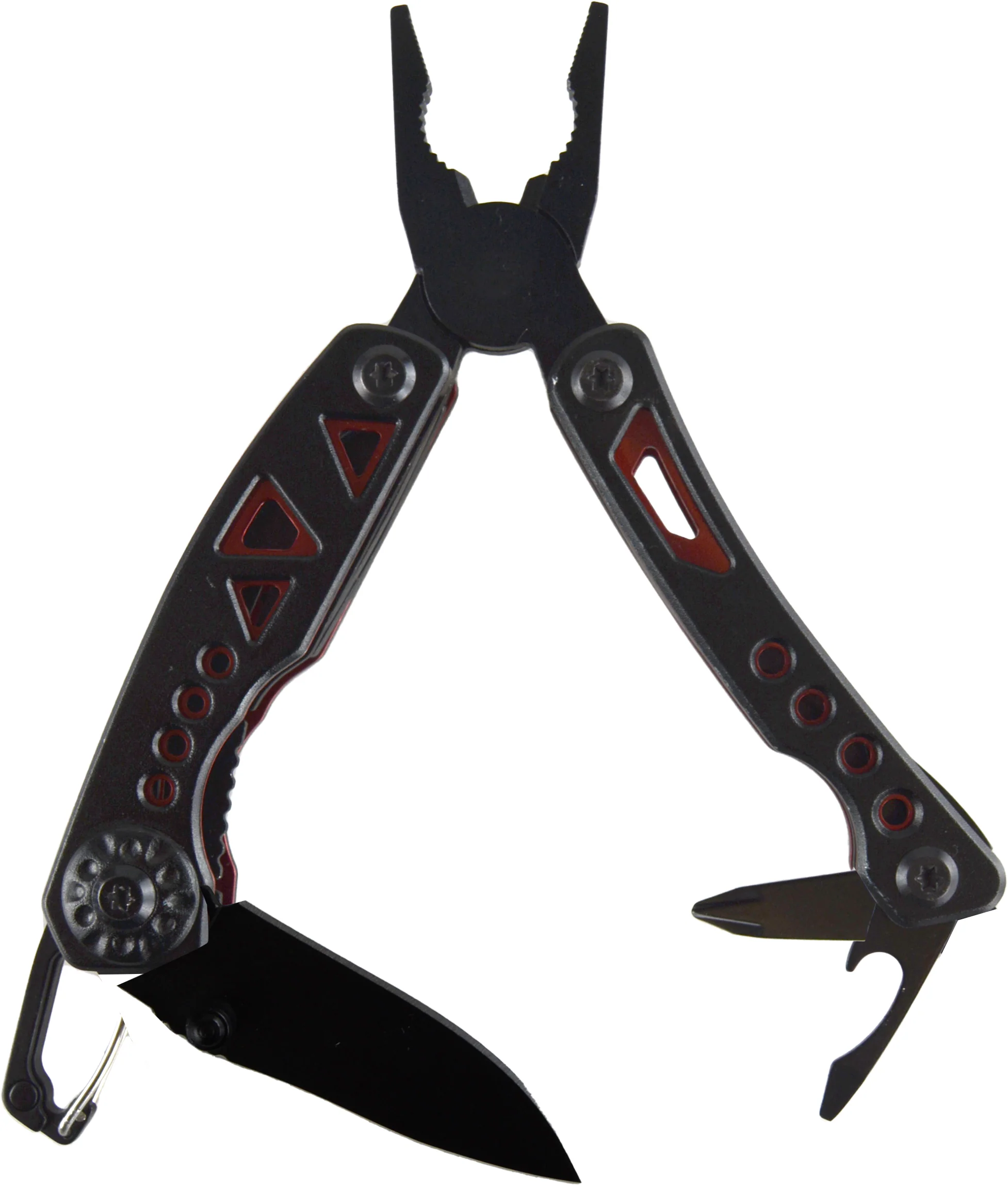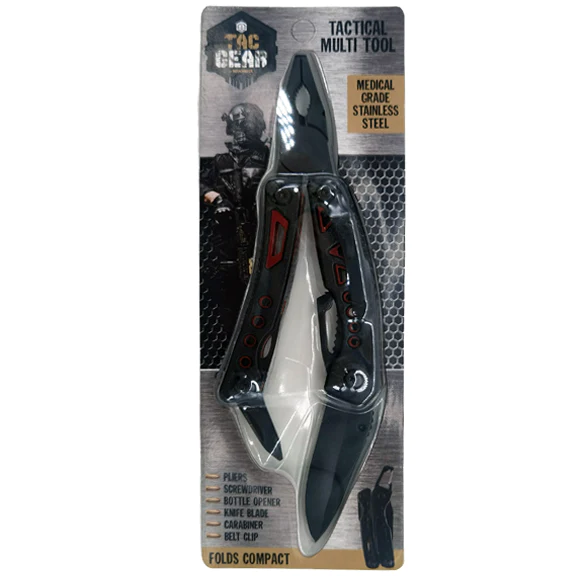 This Tac Gear Multitool is medical grade stainless steel. It has pliers, a screwdriver, a bottle opener, a belt clip, a knife/blade, and it folds compact.