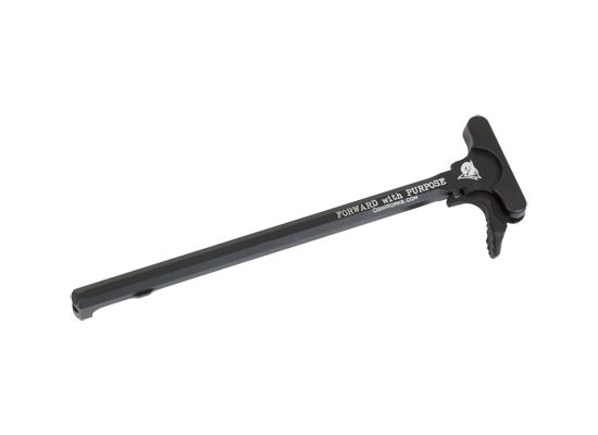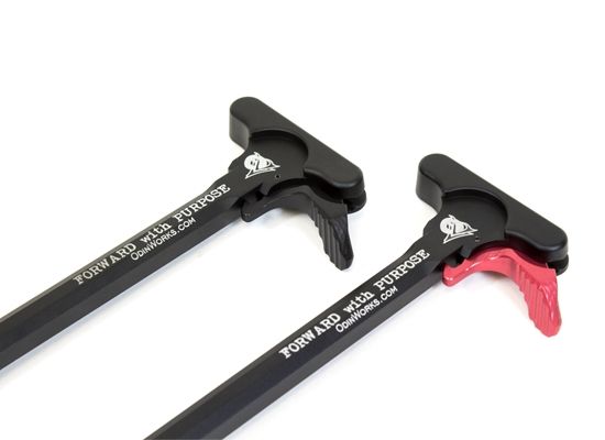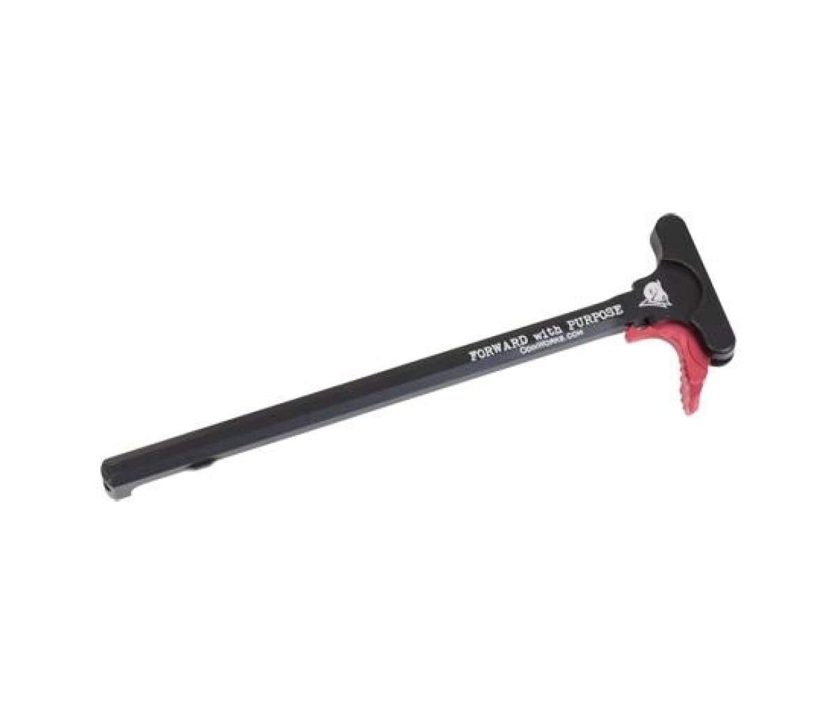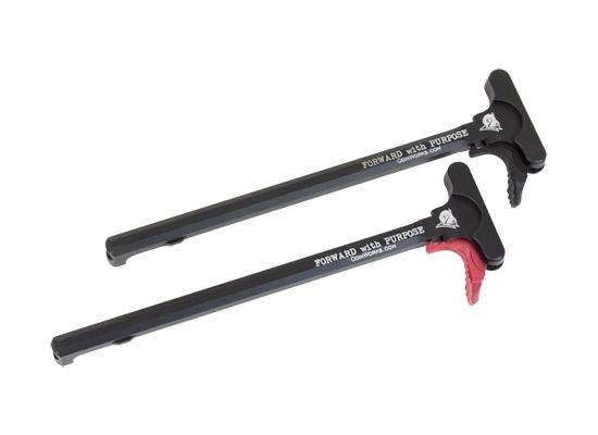 It’s made of high quality 7075 Aircraft Grade Billet Aluminum, and it has an ergonomic design that was made specifically for comfortable operation in various conditions. It can be used for any AR-10 or LR-308 type platforms, and you have the option of a Black or a Red colored XCH (Extended Charging Handle) Latch. The Black XCH latch would be a better color choice to match most any AR rifle or pistol, but the Red XCH latch would be better for a competition platform cause it’s easier to see in the heat of the action. The Red XCH latch is also a great addition to your firearm if you run a two-tone AR in red and black. The charging handle has the words “Forward With Purpose” on it, as well as the company name/web address.