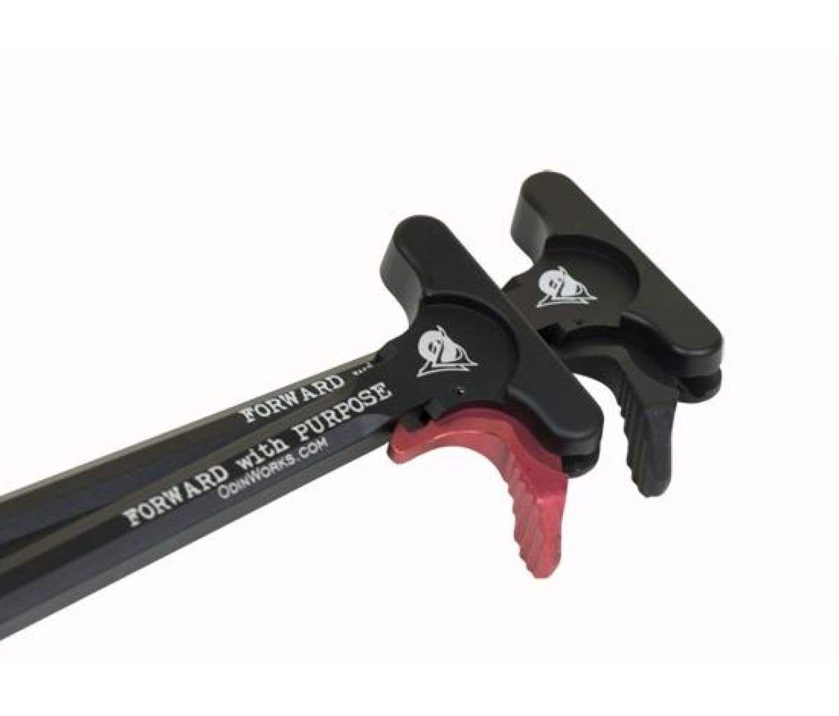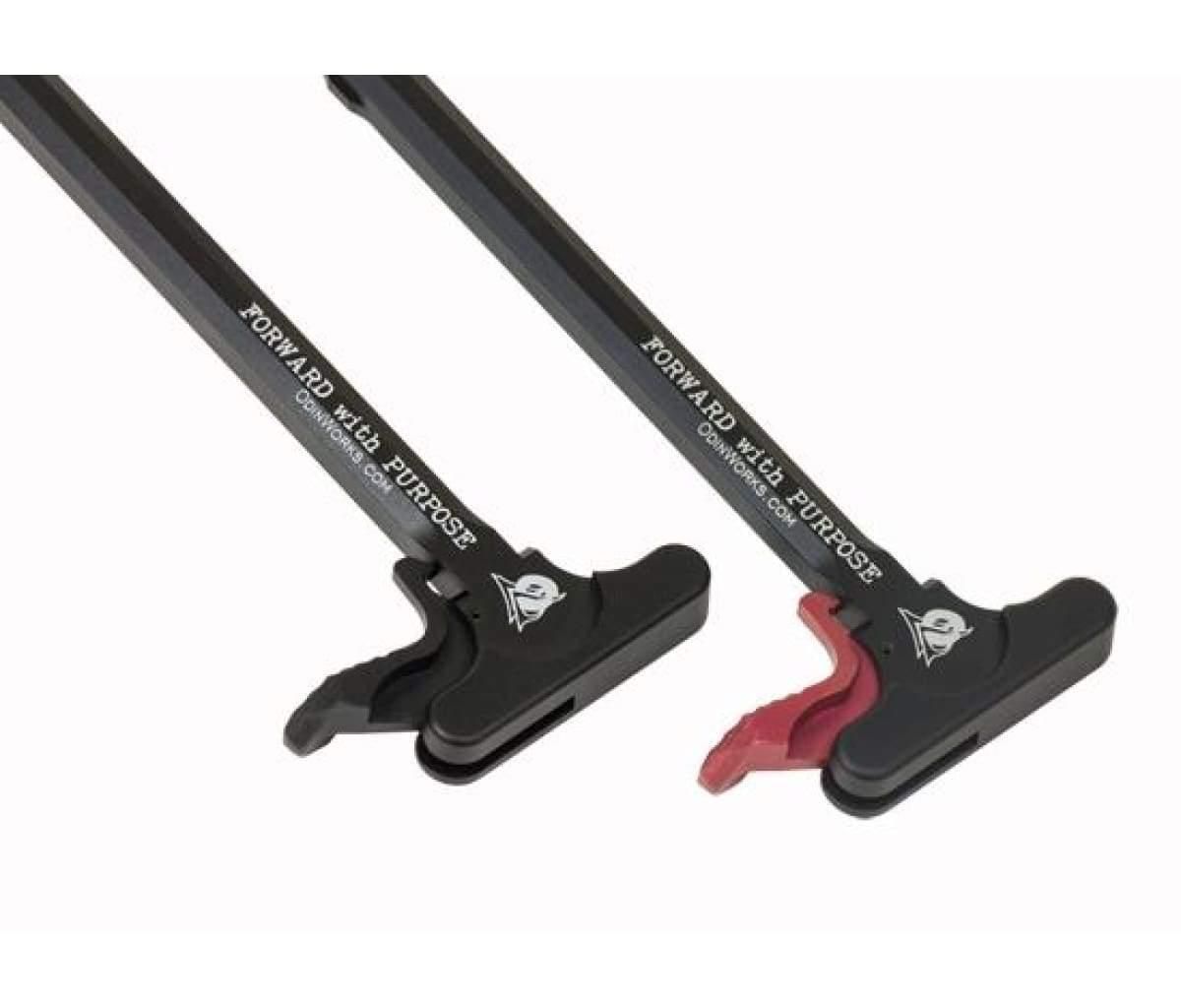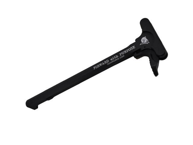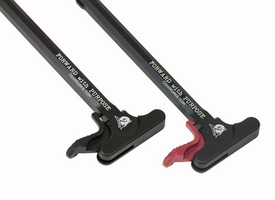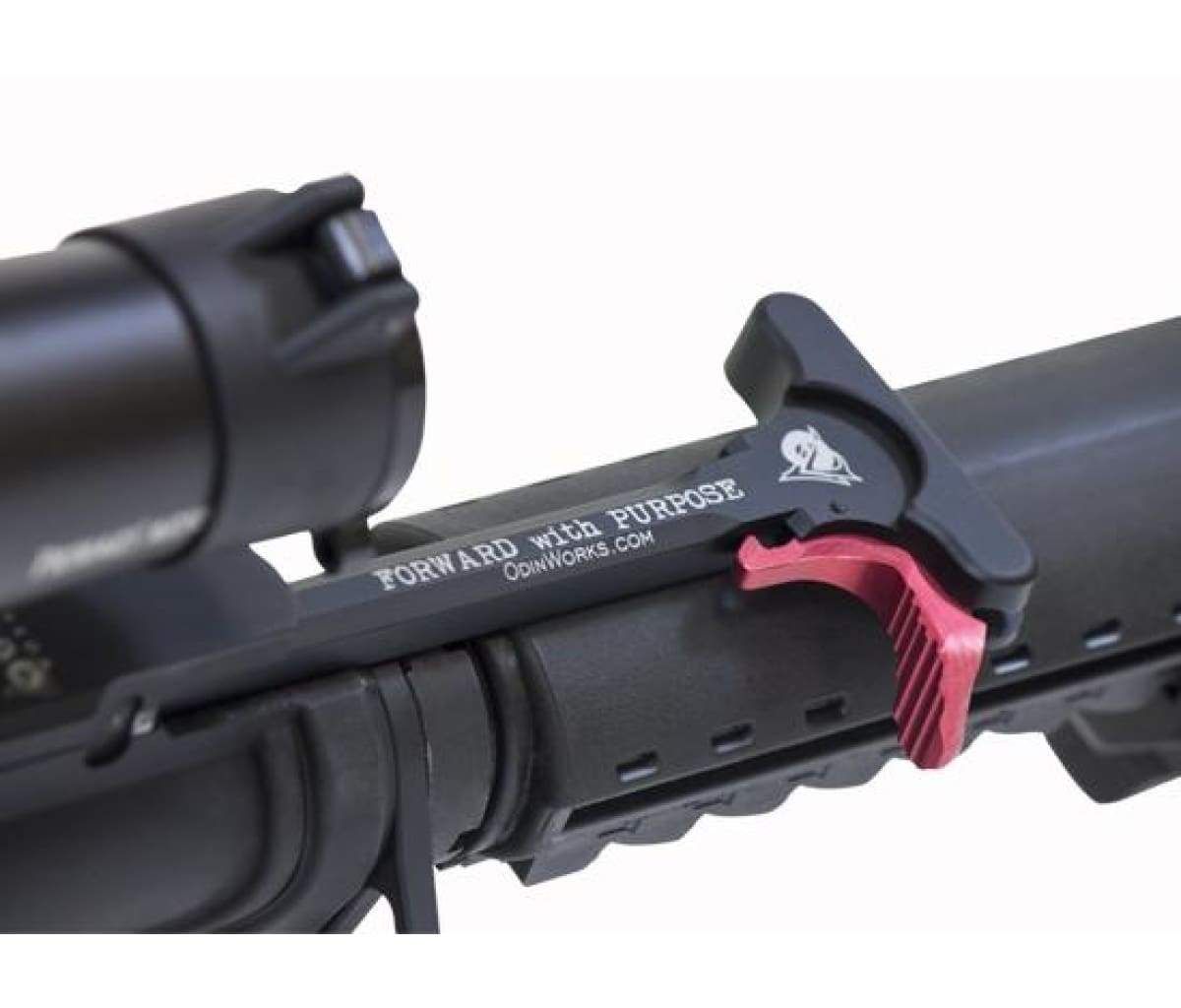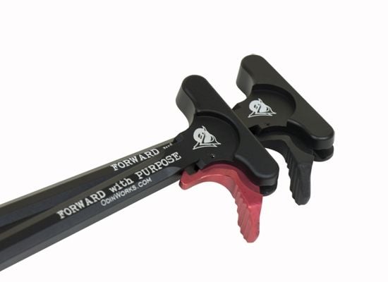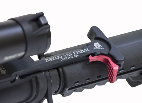 Its made of high quality 7075 Aircraft Grade Billet Aluminum, and it has an ergonomic design that was made for comfortable operation. It can be used for any AR-15 type platform, and you have the option of a Black or Red colored XCH (Extended Charging Handle) Latch. The Black XCH latch would be a better color choice to match most any off-the-shelf AR rifle or pistol. The Red XCH latch would be better for a competition platform cause its easier to see in the heat of competitive action. The charging handle has the words “Forward with Purpose” on it, as well as “ODIN Works” and their web address. It’s ready to use, no mods necessary.