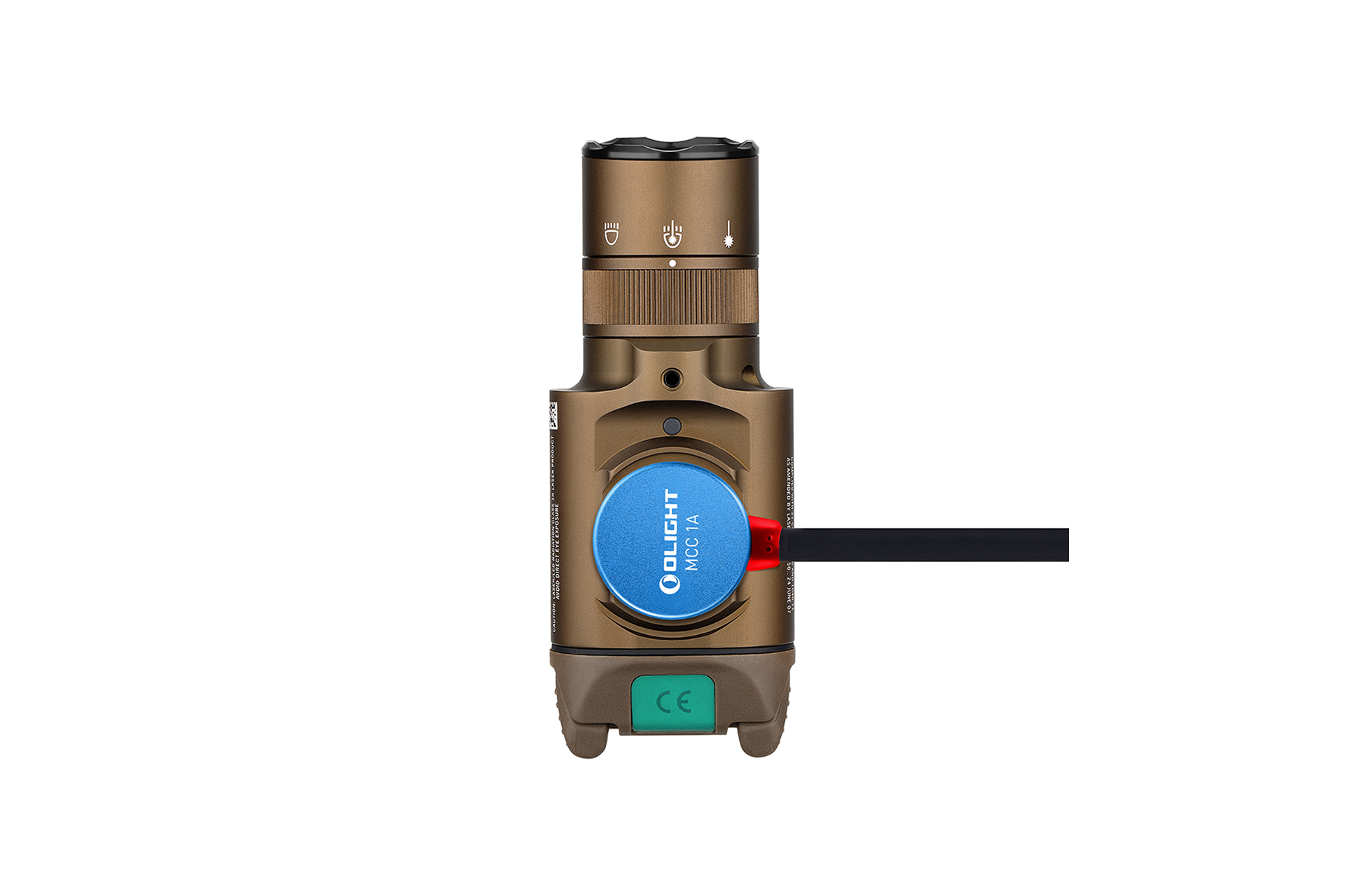 The Olight Baldr Pro R comes in a tan color and includes a Picatinny (MIL-STD-1913) Rail Mount Adapter, Rail Adapter Screws, adjustable screws, an H1.5 Allen Wrench, an MCC 1A USB Magnetic Charging Cable, and a user manual.