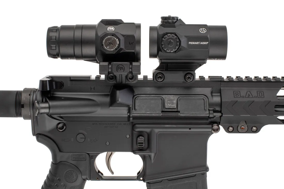 The Primary Arms SLx Flip-To-Side Magnifier Mount is designed to place your magnifier at 1.41 inches above the top of the picatinny rail. Additionally, it includes spacers allowing for a 1.535″ and 1.64″ centerline height, so you can easily line it up with your optic. It features a low profile design manufactured from 6061-T6 aluminum with two steel alloy crossbolts that apply up to 55 in-lbs or torque to ensure a rock solid mount. This magnifier mount also utilizes a direct bolt system to interface with the magnifier instead of a traditional ring design in order to save weight, increase strength, and eliminates the possibility of the magnifier slipping or twisting in the mount.