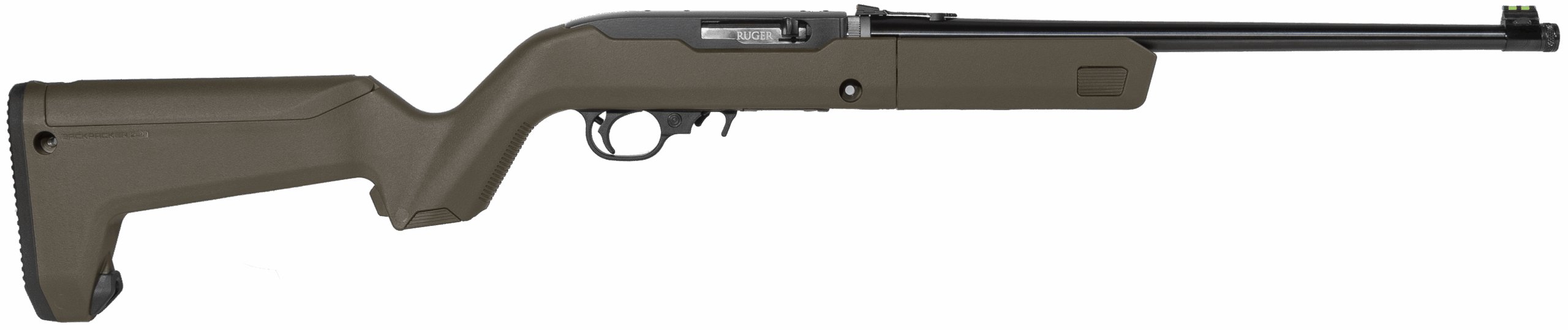 Ruger’s 10/22 Takedown features easy, quick separation of the barrel from the action for ease of transportation and storage. Simple reassembly allows for a secure connection of the barrel and action and returns the firearm to zero, even when receiver-mounted optics are used, ensuring consistent accuracy, shot after shot. The detachable 10-round rotary magazine features a unique rotor to separate cartridges and provide reliable feeding. The 10/22 has an easy-to-use extended magazine release that provides smooth, no-fuss removal of the flush-mounted magazine; push-button, cross-bolt manual safety; precision-rifled, cold hammer-forged barrel; fiber optic sights with an adjusdtable rear. The trigger housing assembly is precision-made of high-tech heat-stabilized, glass-filled, polymer for improved manufacturing tolerances, impact and abrasion-resistance, and unmatched ability to withstand the elements. This Takedown model features a Magpul Backpacker stock with an exclusive OD Green finish. It includes four 10-round BX-1 magazines (three in stock), and a combination scope base adapter for both Weaver-style and .22 tip-off scope mounts.