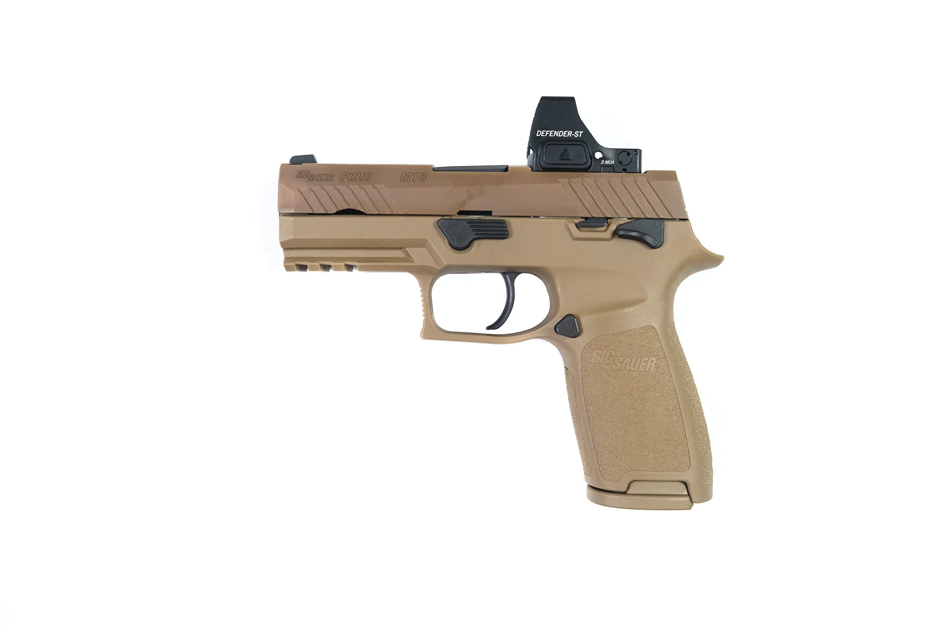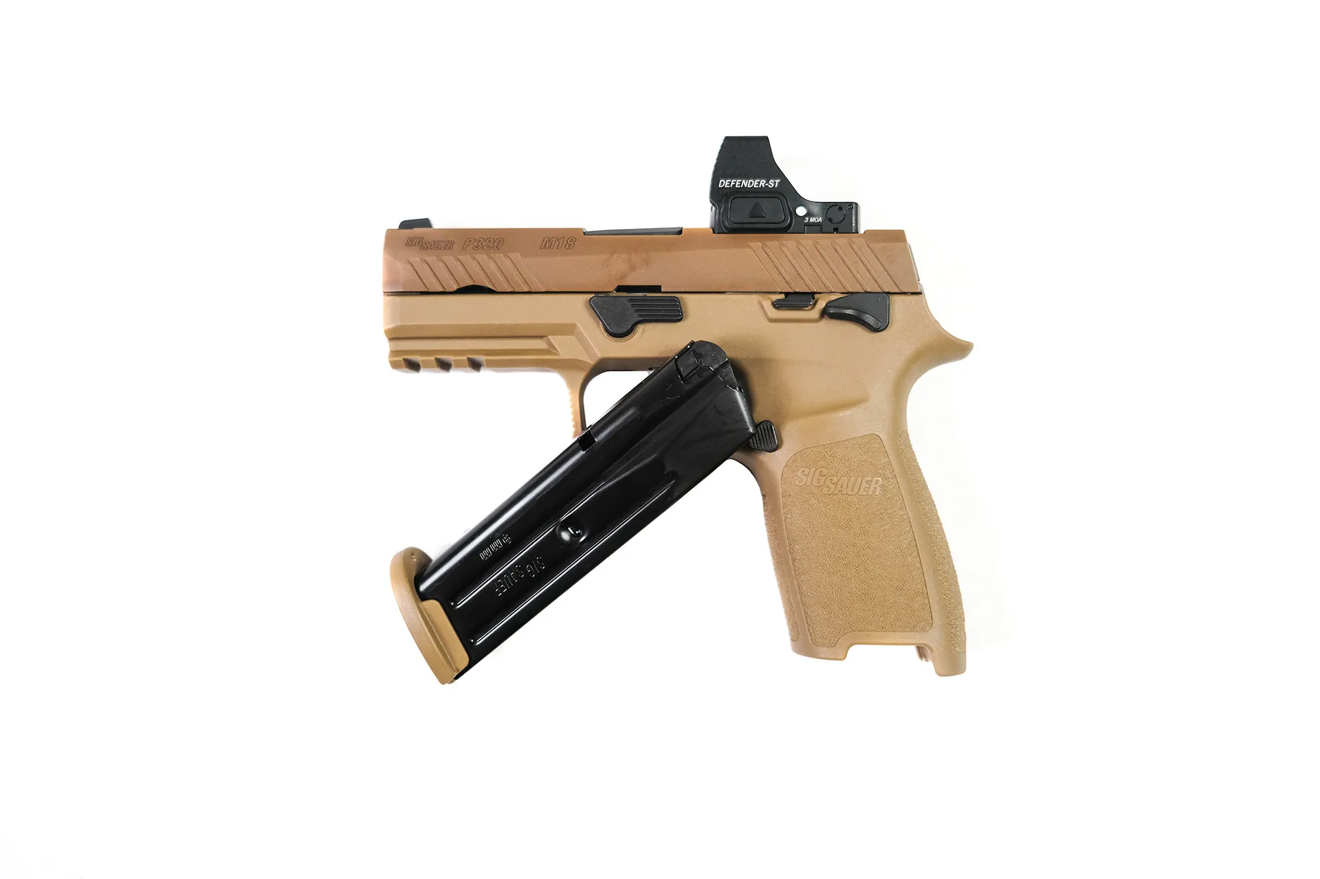Embracing the classic P320 modularity, this model features a magazine disconnect for additional safety and is finished in a unique Flat Dark Earth (FDE) color that mirrors the military version.