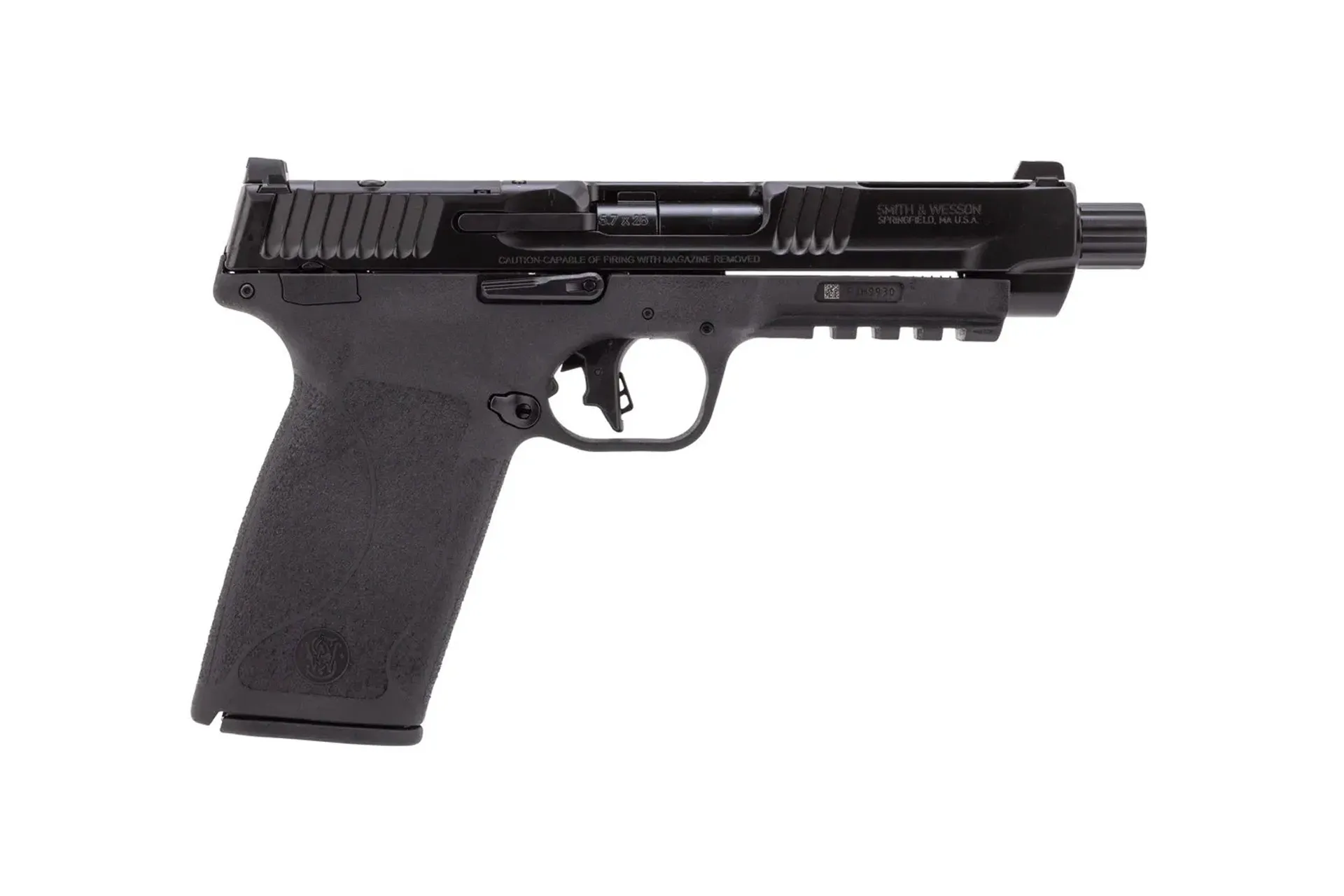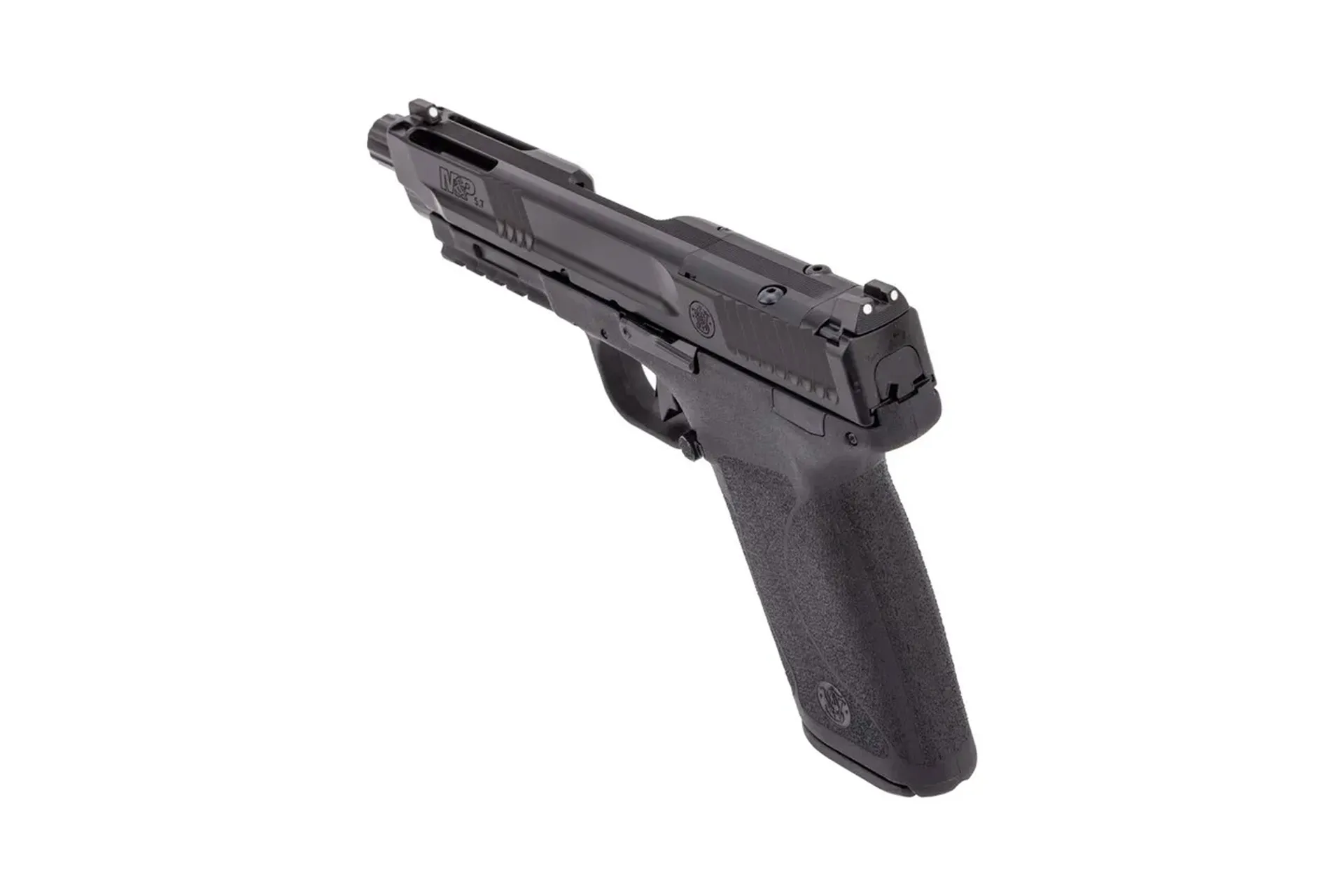 The Smith and Wesson M&P 5.7 builds on the proven track record of the M&P platform and introduces new improvements like the Tempo Barrel System to improve the shooting experience substantially. This 5.7x28mm pistol has an optic-ready slide, with an ambidextrous slide release and front and rear serrations for improved manipulation. The rotating, threaded 5-inch Tempo barrel utilizes the ballistic properties of the 5.7×28 cartridge to facilitate fast, repeatable, and accurate shots. The gas operated, locked breech Tempo system does not allow the barrel to cam until the bullet has passed the gas port. This pistol features a reversible magazine release, two 22-round magazines, a slim textured grip, and a crisp single action trigger break.