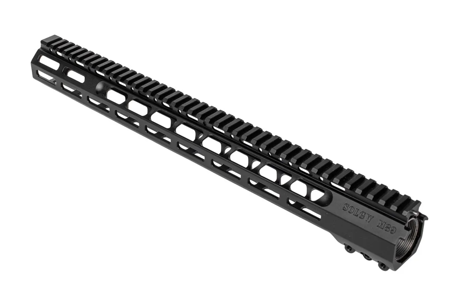 - M-LOK slots at 45° positions