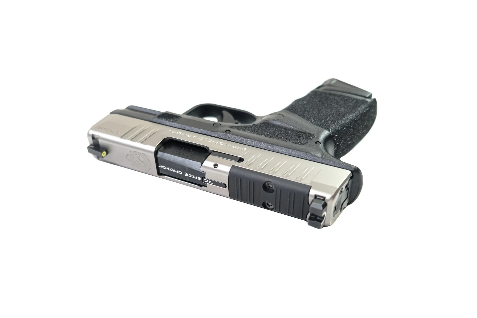 Springfield Hellcat California Stainless features unique top slide serrations to maximize your grip on the slide; non-proprietary accessory rail allows you to accessories with your favorite light and/or laser; Tritium/Luminescent front sight, Tactical Rack U-Notch rear sight; reversible mag release, loaded chamber indicator and custom pressure activated grip texture. Includes 2 magazines and case.