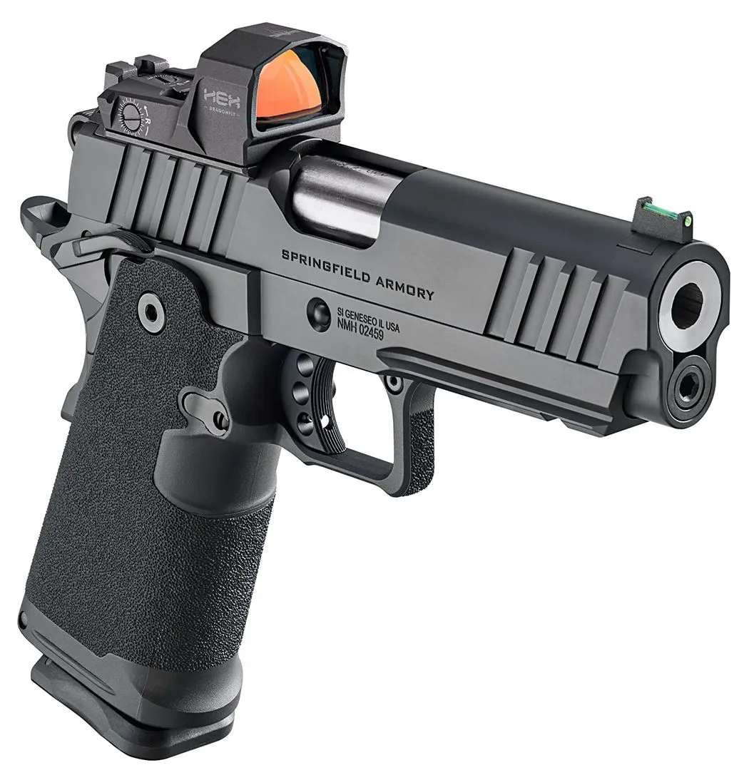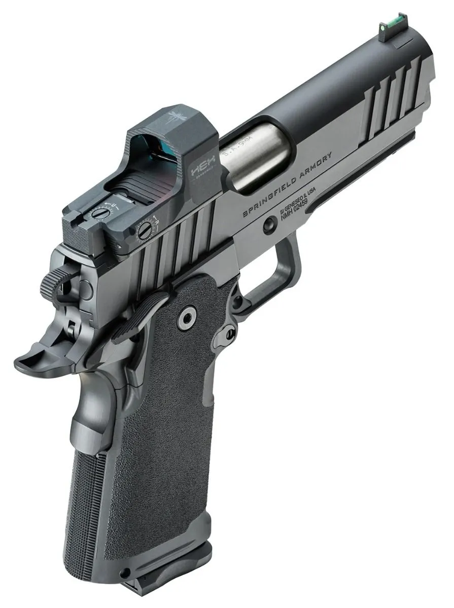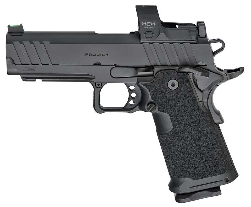 The Prodigy from Springfield Armory takes the proven 1911 platform and enhances it with double-stack capacity, performance-driven feature set and a bundled HEX Dragonfly red dot. Reconfigured around a double-stack magazine, the Prodigy’s polymer grip module mounts to its forged steel frame offering capacities of 17+1 and 20+1. Optics ready with an ambidextrous safety and Picatinny rail the Prodigy combines the most beloved characteristics of the 1911 with modern capacity for unrivaled performance.