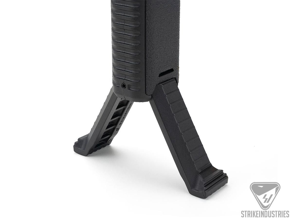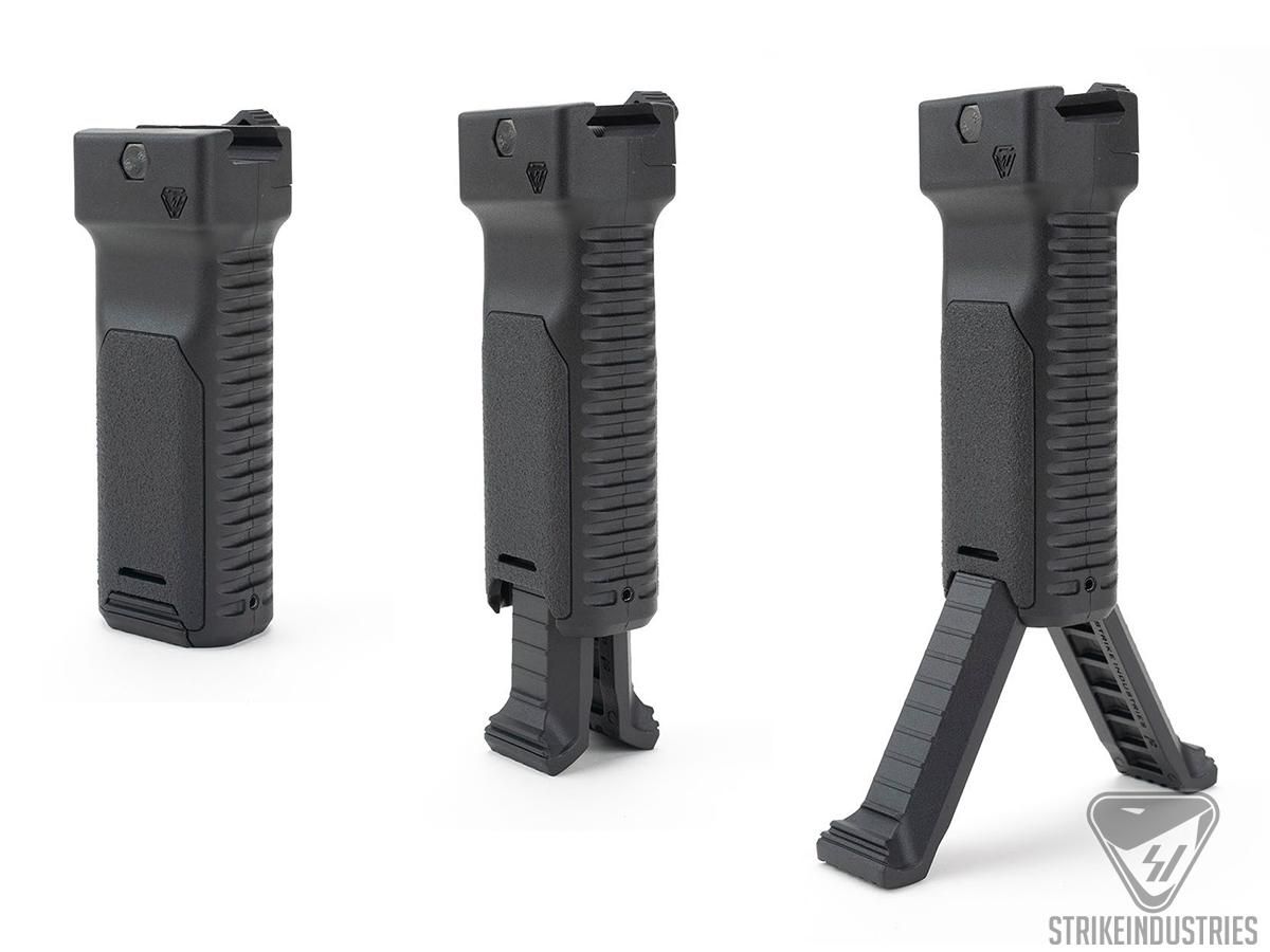 The Strike Bipod Grip offers versatility and efficiency to your rifle for maintaining a firm grip when on the move or a steady stationary platform when prone shooting at a sleek, simple and the most affordable option on the market. With various shooting situations and scenarios, there are advantages from an attachment which is both a grip and a bipod. If you have to navigate a building in a Close Quarters Battle (CQB) situation to laying prone right outside taking mid to long range shots, this bipod grip combo will certainly be of use to you. Competition shooters, hunters and a day at the range offer multiple benefits when real estate and weight makes a difference. Easy quick install and removal of the Strike Bipod Grip to 1913 Picatinny rails with the Quick Detach (QD) clamp and 3-arm knob. No fuss simple pull mechanism to deploy bipod legs with a light squeeze and push up to put away. The grip angle sits on the handguard at 89 degrees. Designed with textured palm and finger areas with flat sides for positive handling and easier manipulation of the firearm. Made from durable and lightweight polymer, the Strike Bipod Grip gives you two useful tools together to save rail space without adding any significant amount of weight at a bargain price.