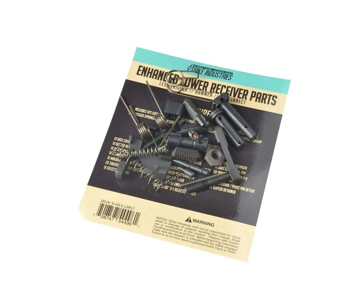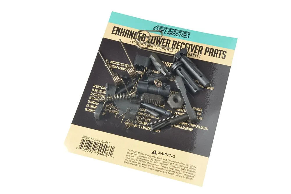 The Enhanced Lower parts kit offers a convenient upgrade package for the AR-15 for those looking for a complete Strike Industries solution for new builds, or to update their plain jane AR. This kit includes all the basics that you will need to build out your AR (minus grip), but with Strike Industries Enhanced lower parts where applicable.