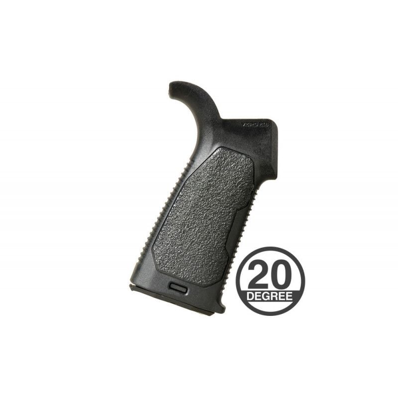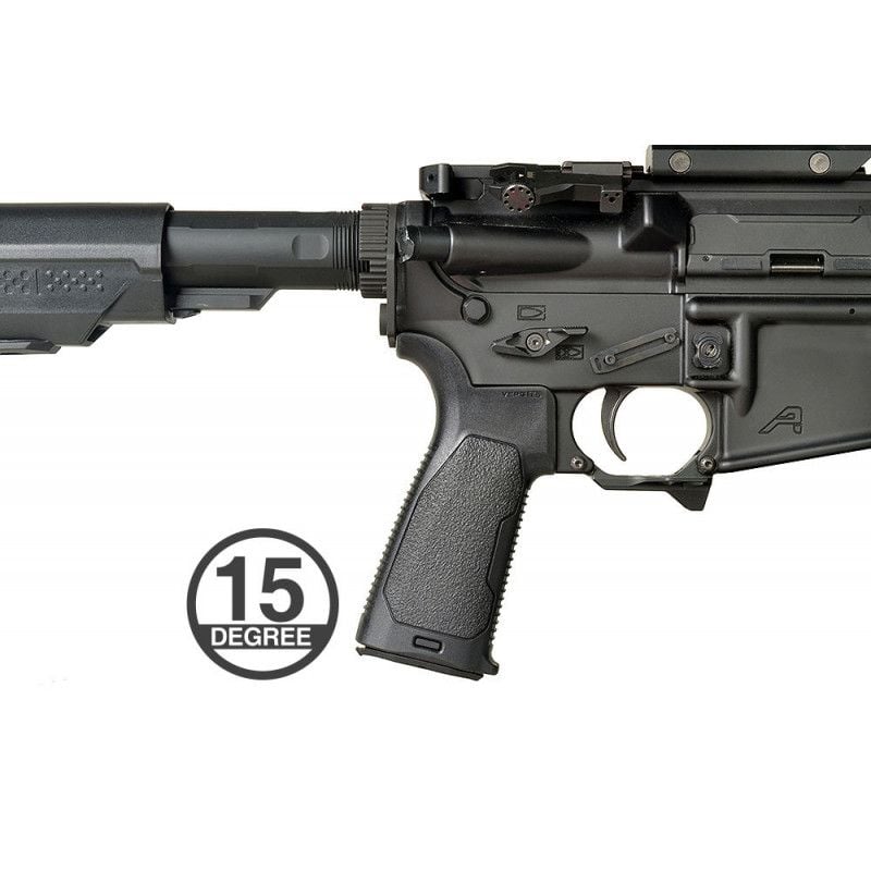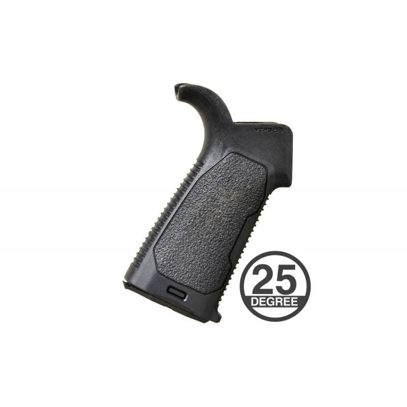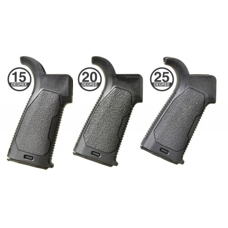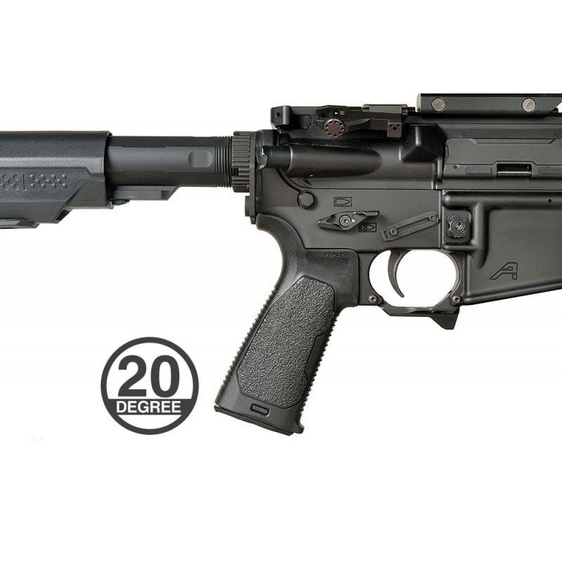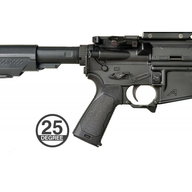 The 25-degree grip has an aggressive angle similar to the traditional A2 grip. It’s meant for the traditional rifleman grip where the shooter would stand bladed and the shooting elbow is canted outwards.