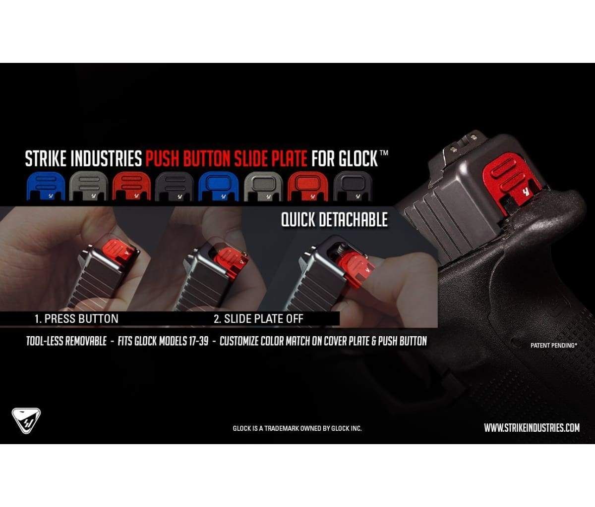 The Strike Industries Slide Cover Plate for GLOCK is perfect for those who are looking for an aesthetic and functional upgrade to their GLOCK pistols. The SI Slide Cover Plate for GLOCK allows for tool-less disassembly of the firing pin and extractor using a (patent-pending) push-button design for greater ease of maintenance. Machined from aircraft grade aluminum and anodized, the SI Slide Cover Plate is significantly more durable than the factory plastic slide plate.