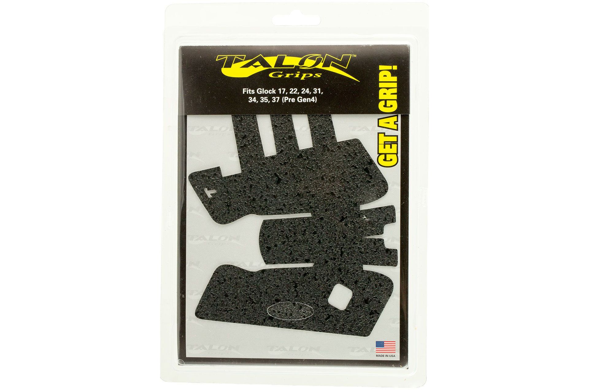 Talon Grips are 100% made in the USA. This low profile grip is custom designed and manufactured for specific firearms to provide an OEM quality fit and finish, adding minimal bulk/size. Adhesive will not move once properly installed and can be easily removed with little to no residue. It is easy to install within minutes (proper installation requires a hair dryer or heat gun). Most cleaning solutions do not harm the grip (avoid aerosol-based solvents such as CLP). The rubber texture provides positive grip on the firearm and is more commonly used for concealed carry (less likely to irritate skin or snag on clothing) and users with softer hands. This item fits Glock Model 17, 22, 24, 31, 34, 35, and 37 (Gen3, 2,or 1). This grip provides full coverage on the side panels including above the thumb rest, ample coverage on the backstrap, and three finger wraps for the finger grooves under the trigger guard. This grip has a logo cutout for the Glock emblem on the left side of the handle. This grip sticks extremely well even with the Rough Textured Frame (RTF).
