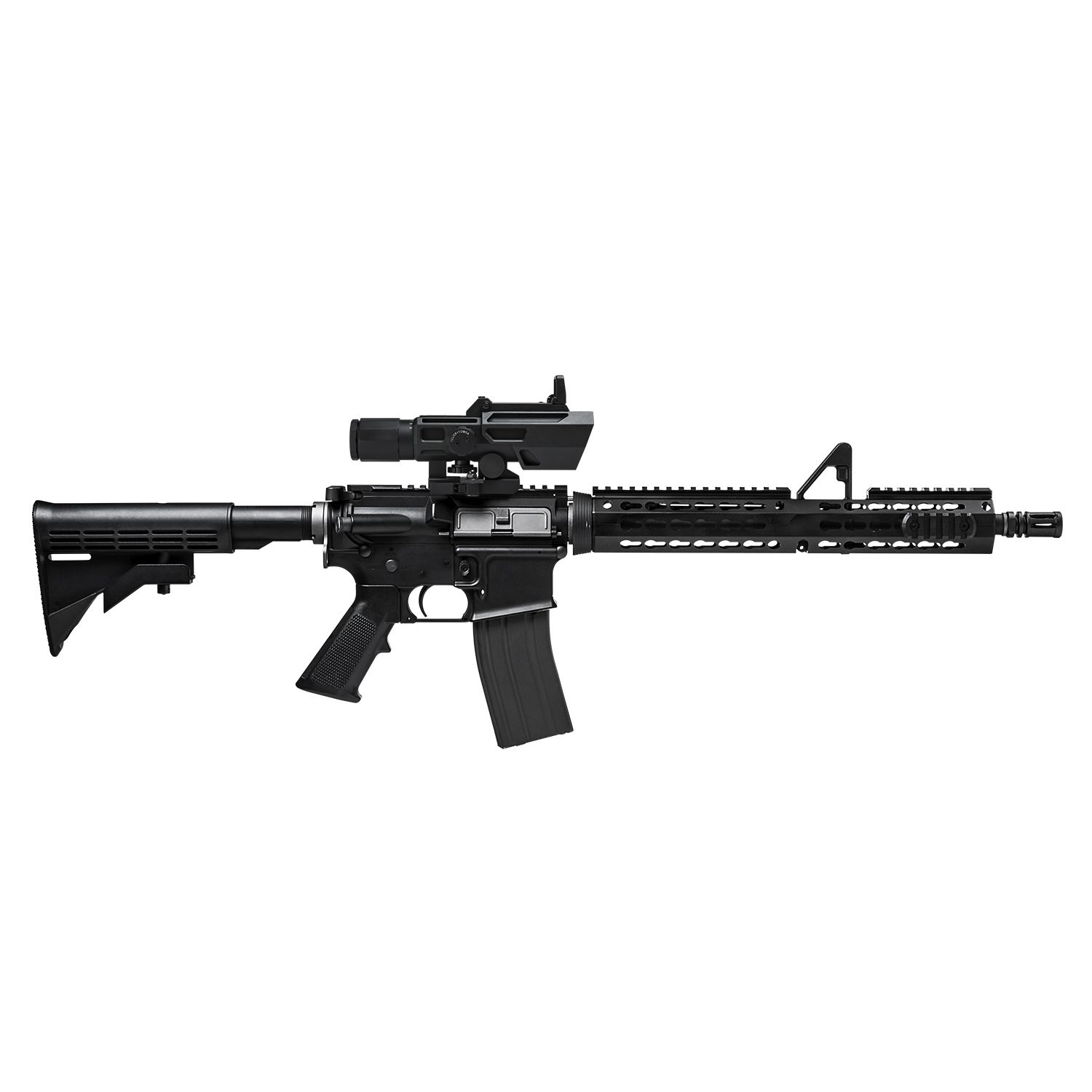 - Red Dot Reflex lens flips up to the deployed position and automatically turns on with the push of a button.