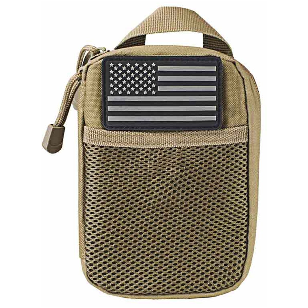 - Front panel has 2″H X 3″W loop fastener with a PVC US flag patch. A front 4.5″H X 4.25″W mesh pocket with hook and loop fastener.