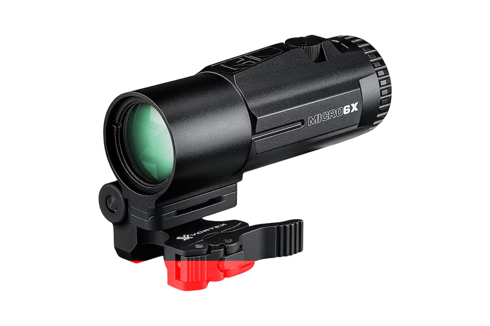 The Vortex Micro 6x Magnifier provides easy on, easy off functionality and is built to seamlessly fit onto your rifle. The Micro 6x magnifier delivers an incredibly compact 6x optical system that takes your red dot farther. The Micro 6x features robust functionality in the field, three mount heights to best fit your setup, and an adjustable flip mount that allows for left or right-handed use. The camlock system engages or disengages with direct pressure, allowing you to raise and lower the magnifier quickly and easily.