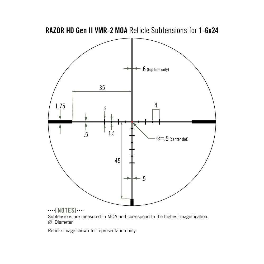This second focal plane scope features an illuminated VMR-2 MRAD reticle. The VMR-2 reticle uses a hashmarked subtension system for ranging, hold overs, and windage adjustments. Uses MRAD based subtension lines for ranging, holdover and windage corrections. For fast hits at closer range, shooters can make use of the illuminated center dot.