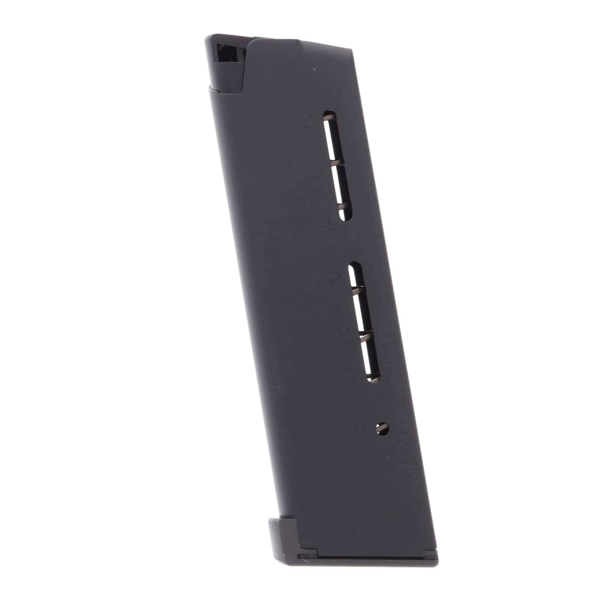 ETM Heavy Duty/+P rated .45 ACP magazines with Wilson Combat exclusive stainless flatwire MAX magazine spring and our time-tested stainless steel ETM tube. Guaranteed to never need replacement, the ETM with MAX spring will change the 1911 magazine forever. Our testing has shown these to be the most reliable 8 round, .45 ACP 1911 magazines in the world. The heat-treated MAX flatwire construction never gets stressed or over-compressed like a conventional spring and is guaranteed tonever require replacement even after high round counts or daily, extreme duty use. Maximum strength-up to 25% stronger than standard 1911 mag springs for superior reliability with defensive and +P loads and more positive slide lockback. Maximum longevity MAX flatwire spring will never lose optimum feeding tension as long as you own the magazine -guaranteed. Extensively tested by the Wilson Combat Shooting Team and testfire crew. Maximum corrosion resistance-heat treated stainless MAX spring won’t corrode in high humidity or marine environments-a leading cause of service pistol spring fatigue. Black models are finished in black nitride QPQ finish-Theultimate in a wear resistant, non-reflective finish. Black nitride QPQ will not chip, crack or peel. This surface treatment is the toughest black finish we could find for our world renowned 1911 magazines.