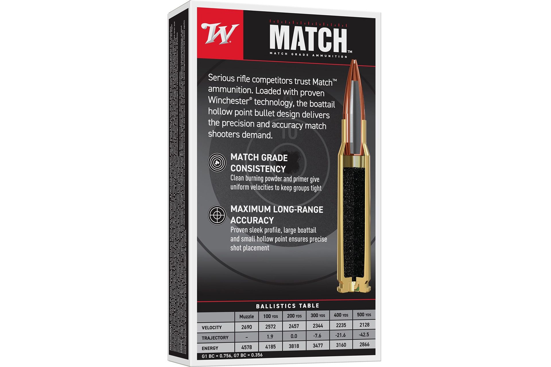 Winchester Match ammunition is loaded with the highest quality components under the strictest tolerances to produce consistent, accurate ammunition for competition shooters. Trusted by hunters for many years, Winchester ammunition is now becoming more available to the match shooter. This ammunition is new production, non-corrosive, in boxer primed, reloadable brass cases.